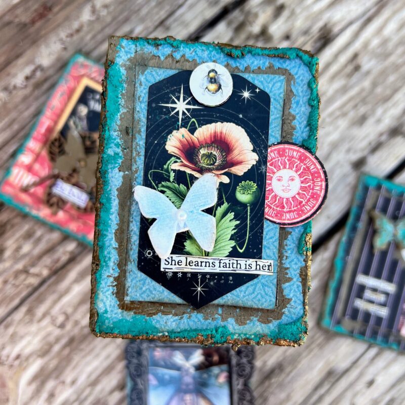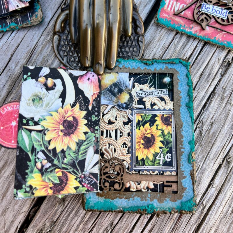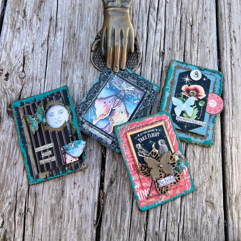 ATC cards are an excellent way to practice new techniques and use up scraps. They are a great place to start if you are new to making ephemera. ATC cards measure 2 1/2″ by 3 1/2″ in size.