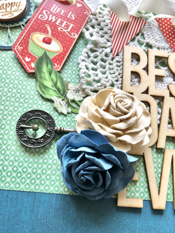 On this layout, other than the Life’s a Bowl of Cherries Ephemera Assortment, I also added the Graphic 45 Rose Bouquet, the Natural Linen Trim and a Metal Clock Key to embellish and finish my layout.