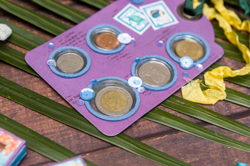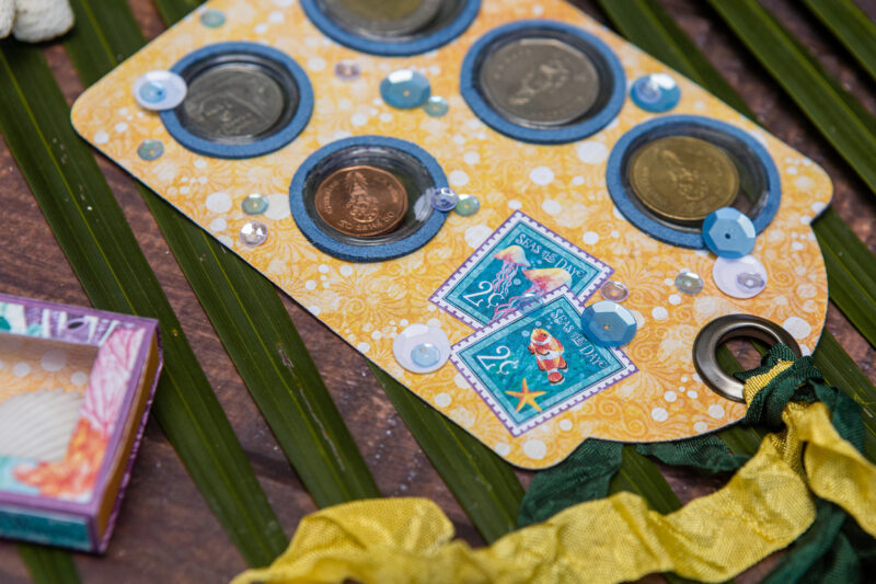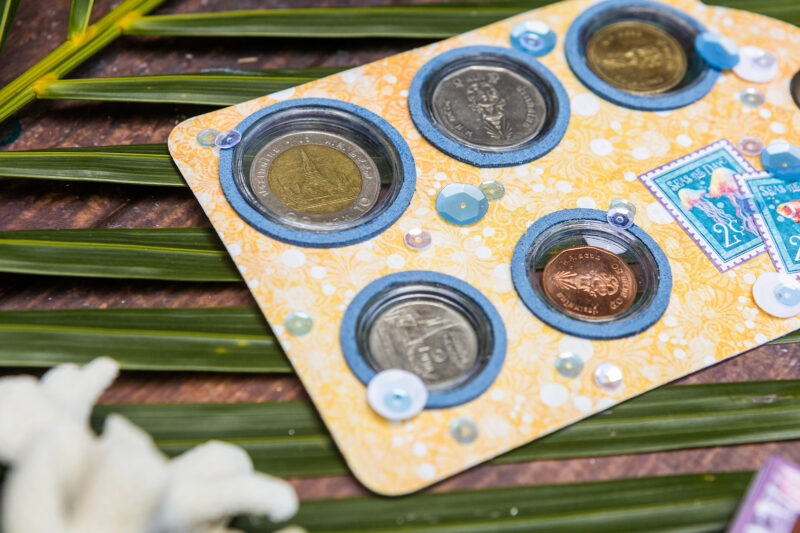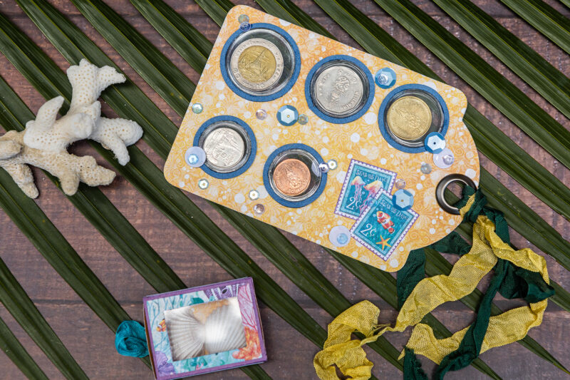 Next, I created a mini photo booklet using Graphic 45 folder die. It’s perfect for your favorite snapshots from the trip. Then I put together a coin envelope again using the Graphic 45 die, but this time from the Policy & Decorative Die set. And finally, I made a very special tag that holds coin holders from the country I visited. It’s a unique way to preserve those little pieces of our journey.