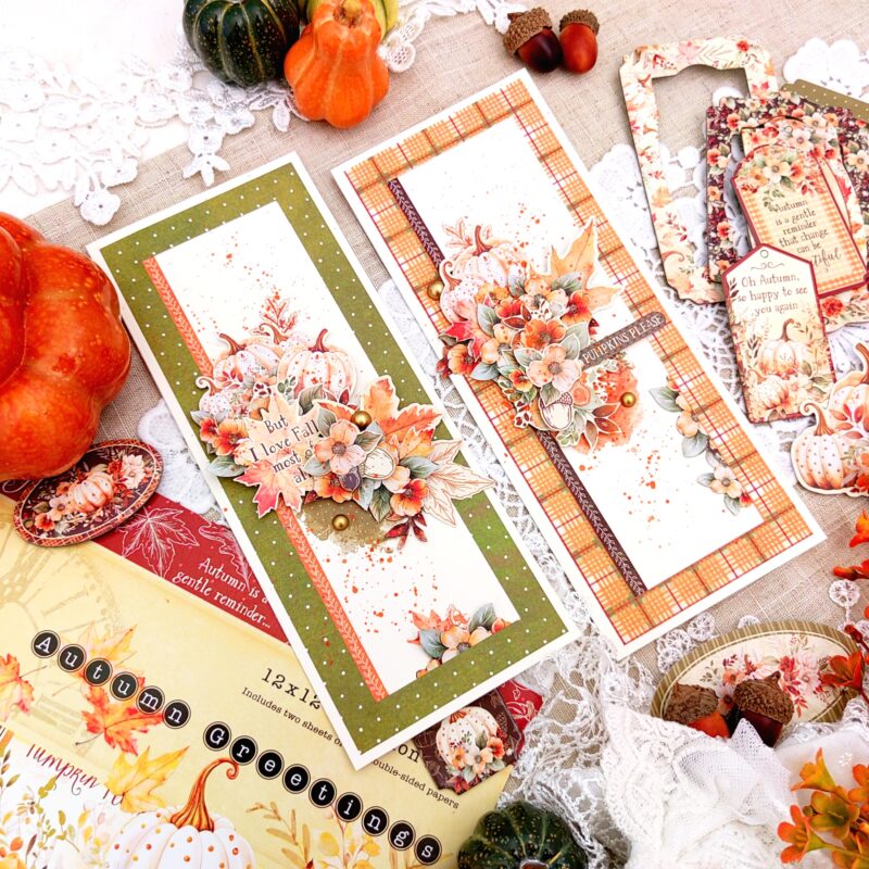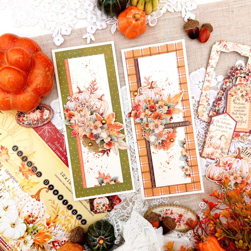I am happy to share my project this month, a set of Slim Line Cards featuring the STUNNING Graphic 45 Autumn Greetings collection.