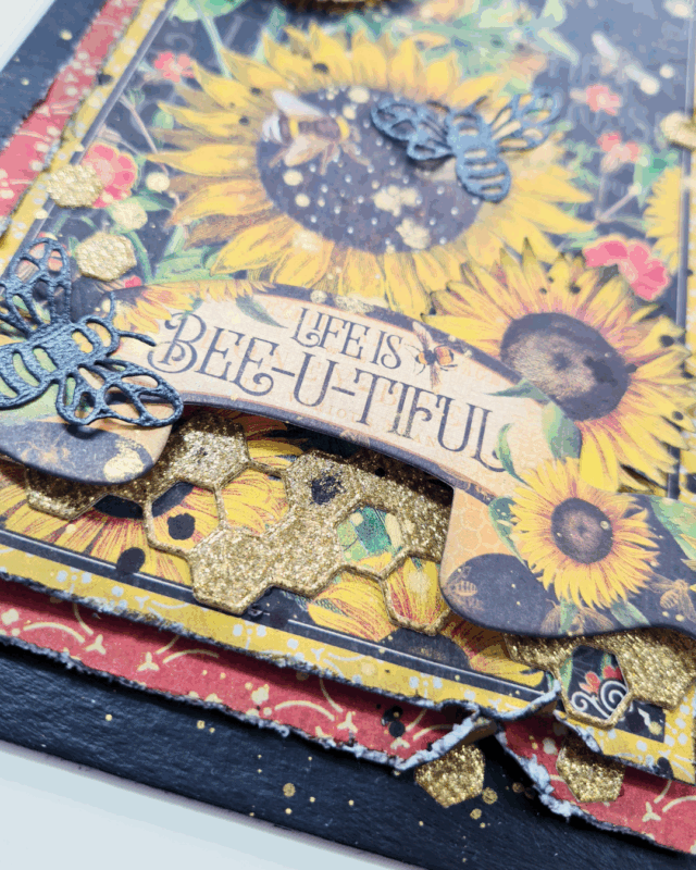 I used two of the die-cuts from the kit with glitter papers. The hexagon pattern was cut double to create more stability, and the bee-banner part was used to create several individual bees.