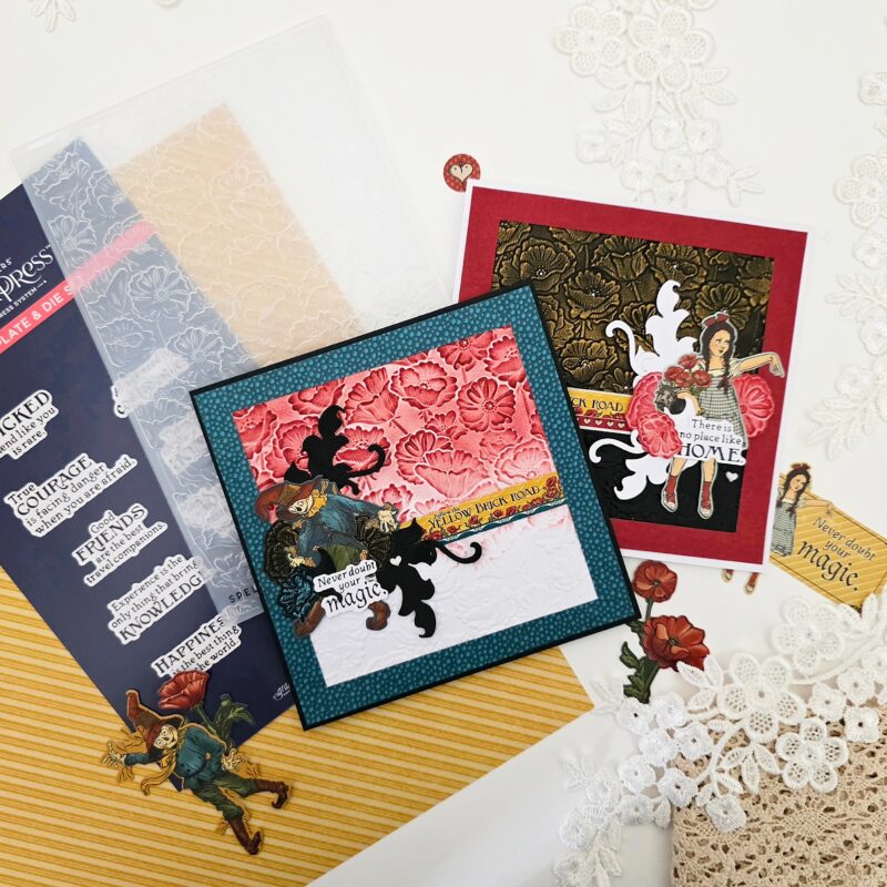 I am happy to share my Cards featuring the STUNNING Graphic 45 Wonder of Oz collection along with the Spellbinders Embossing Folder and Press Plate & Die Sets.