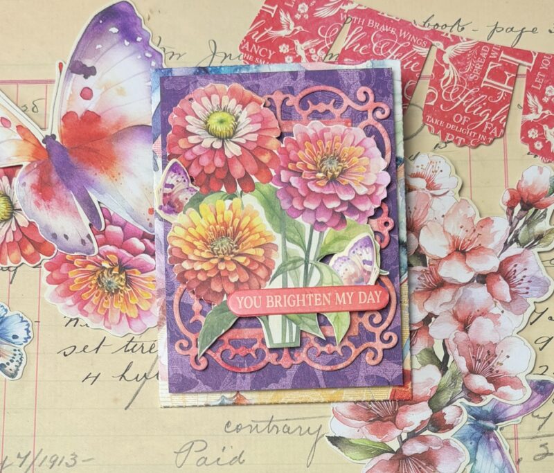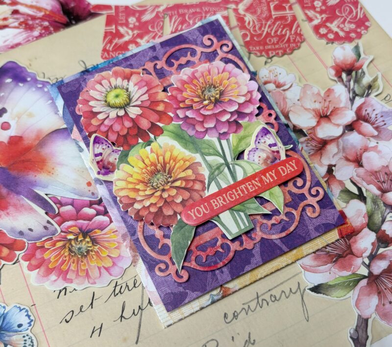 - From the Flight of Fancy Sticker Set, stick the You Brighten My Day sentiment onto a piece of plain paper out of the Flight of Fancy 12×12 Patterns & Solids Paper Pack. From the cardstock stickers, adhere the two purple butterflies to the same piece of paper. Fussy cut around the images. Adhere the You Brighten My Day sentiment to the bottom of the flower bunch. Adhere the two butterflies as desired amongst the flowers.