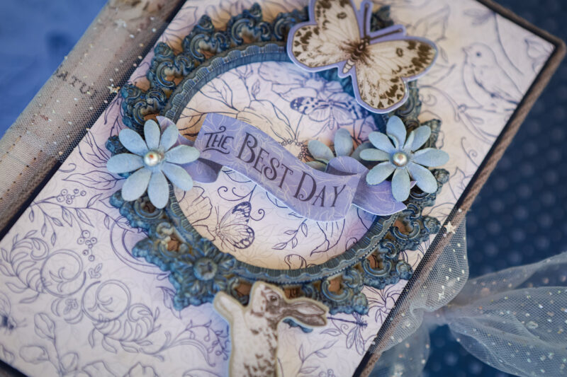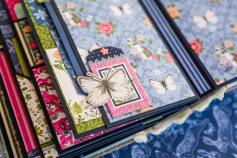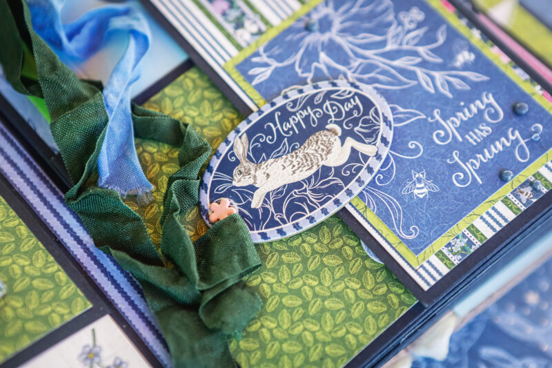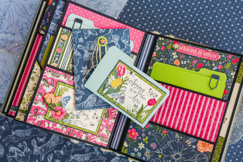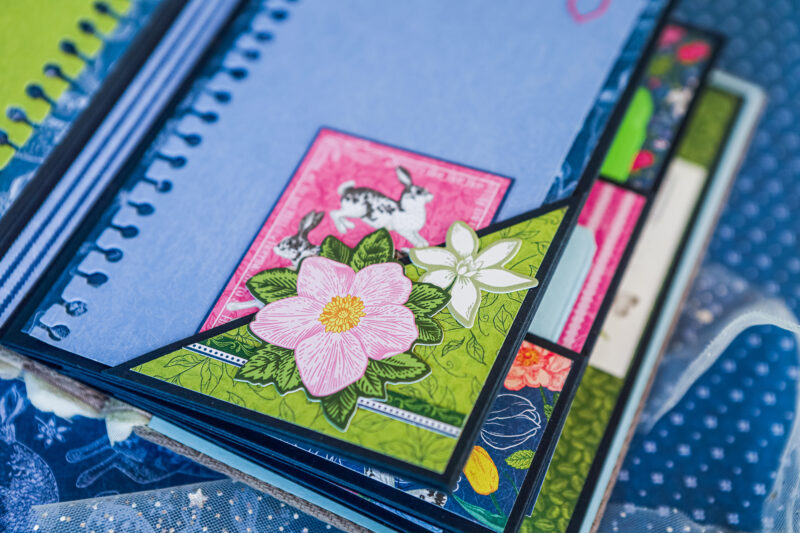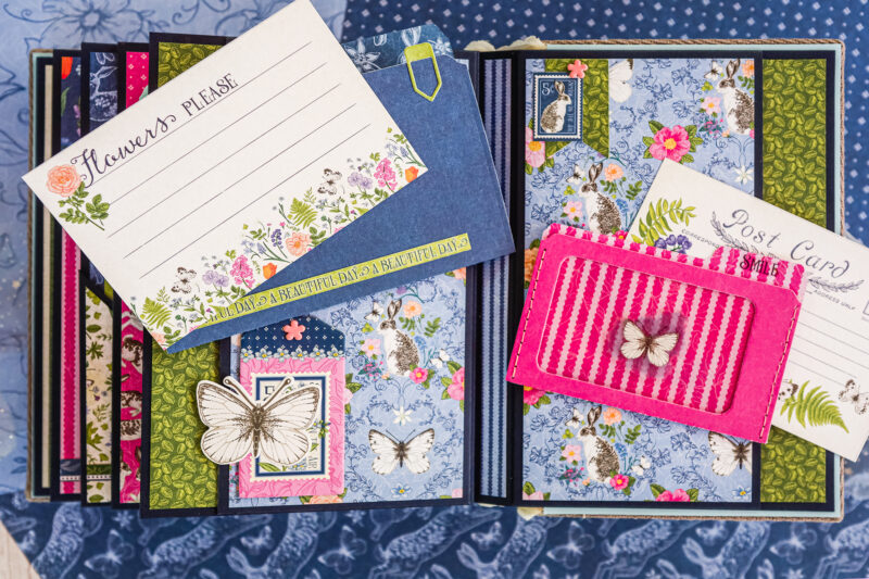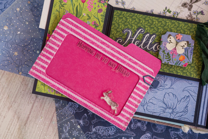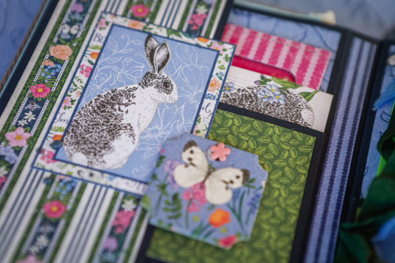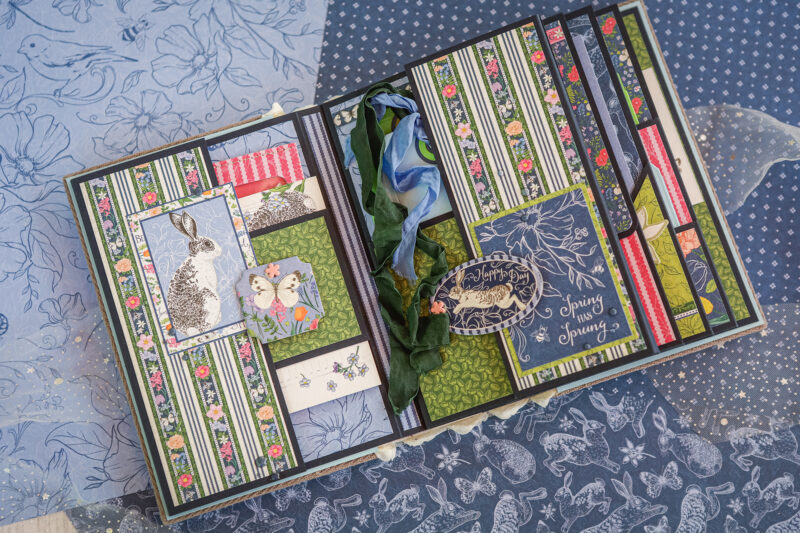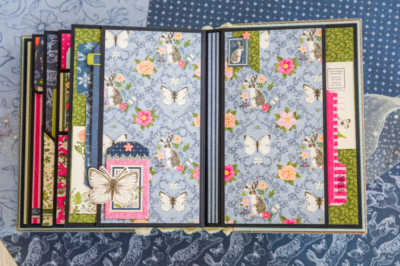 This album is full of soft florals, playful bunnies, butterflies, and beautiful spring colors that bring the whole project to life. I created a detailed base with pockets, flaps, folders, and interactive elements, leaving plenty of room for photos and journaling.
