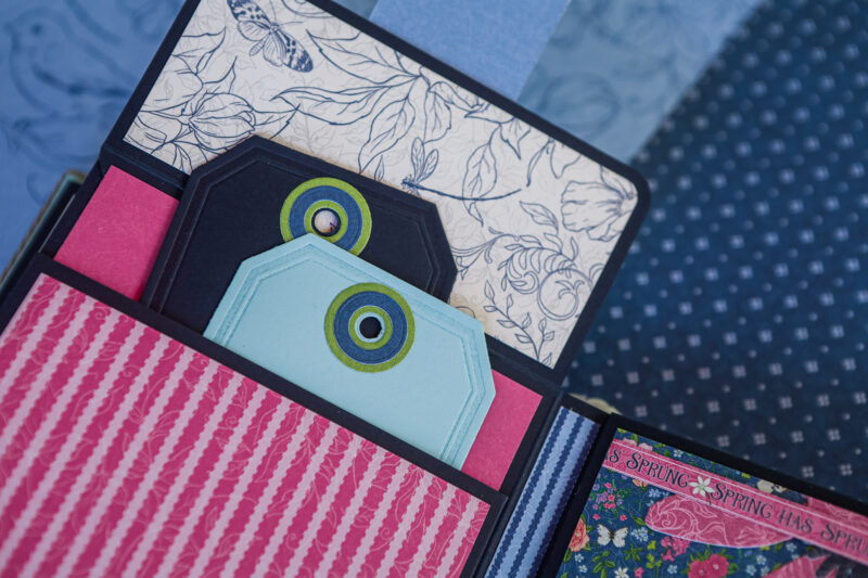 Flaps and pockets are filled with tags and mini folders, perfect for adding photos and memories. I kept the embellishments fairly light to let the paper speak for itself, but added just enough dimension for interest.