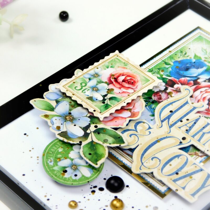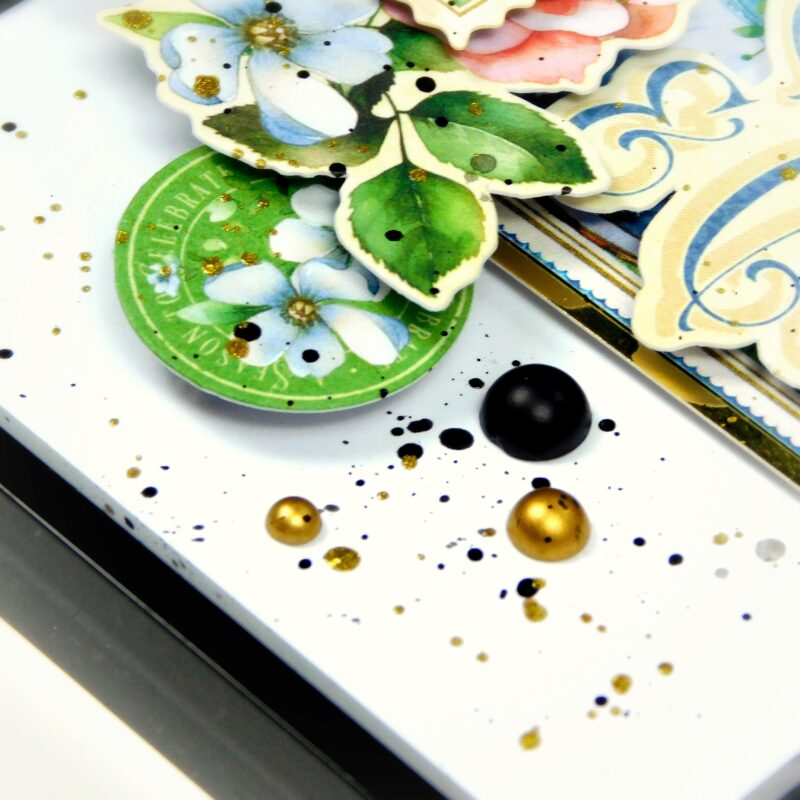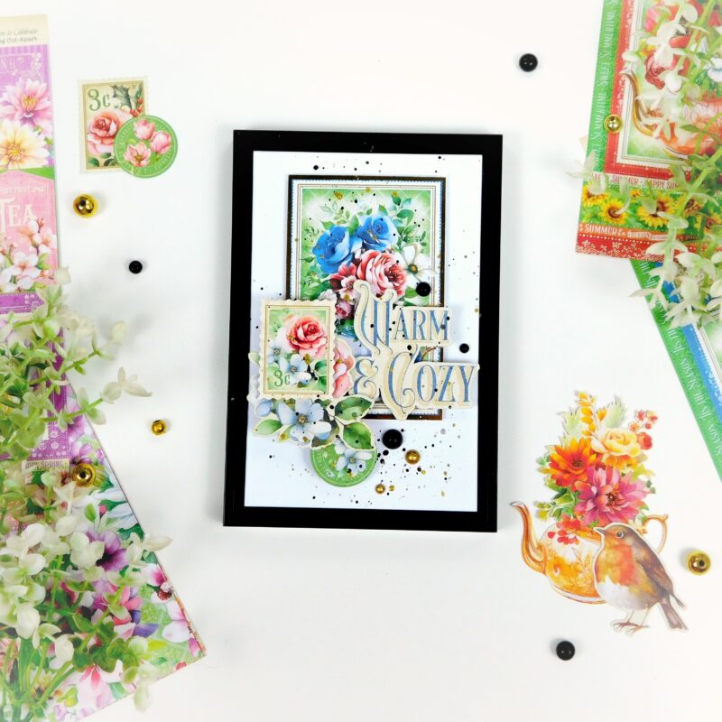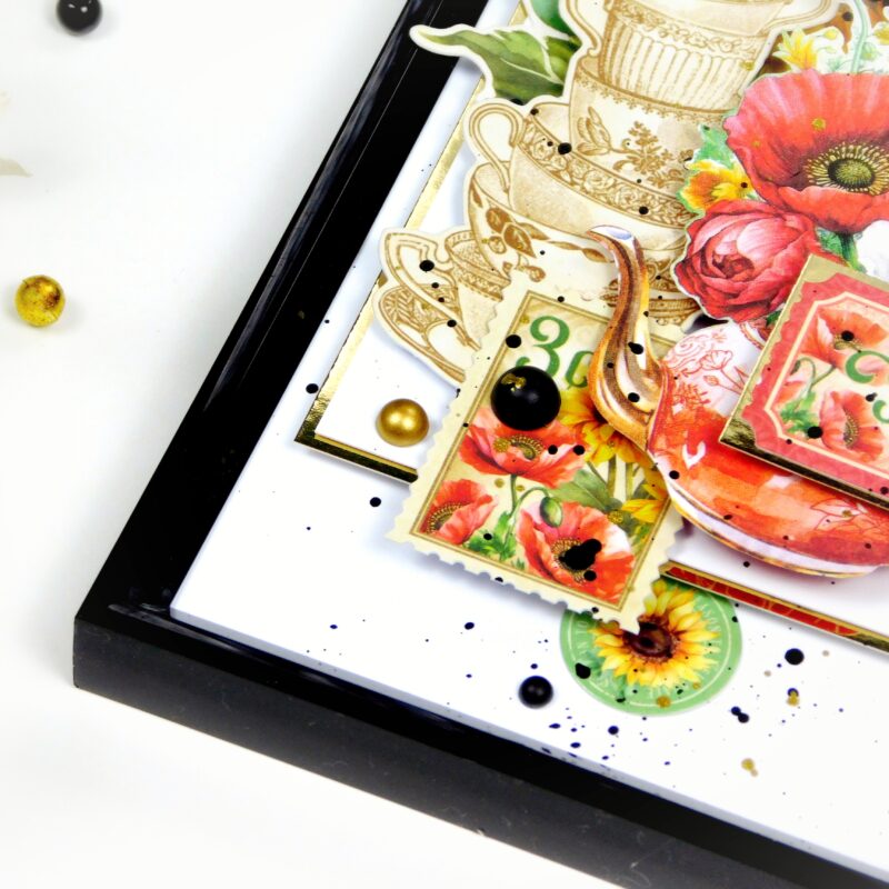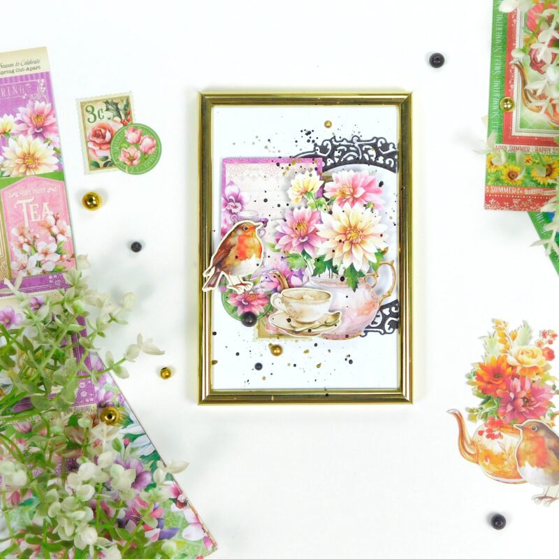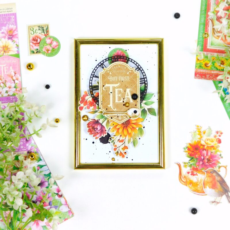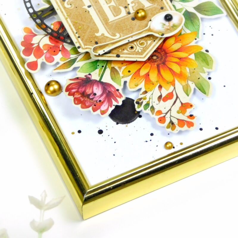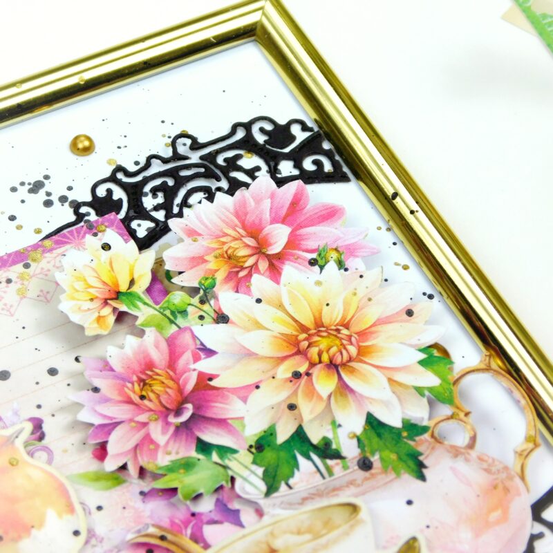 For this project, I used a set of the most budget-friendly photo frames and the stunning Season to Celebrate collection by Graphic 45. Oh, I absolutely love it! The vibrant colors of every season, and those gorgeous teapots – just incredible! The possibilities with this collection are endless – from greeting cards for any occasion to a serious album for flower and tea lovers.