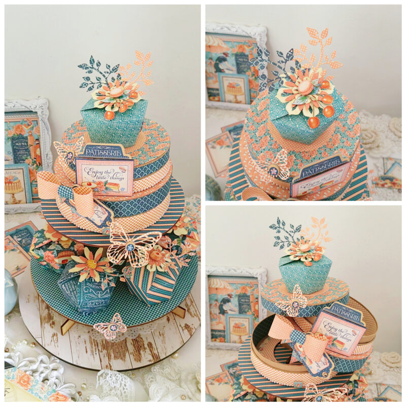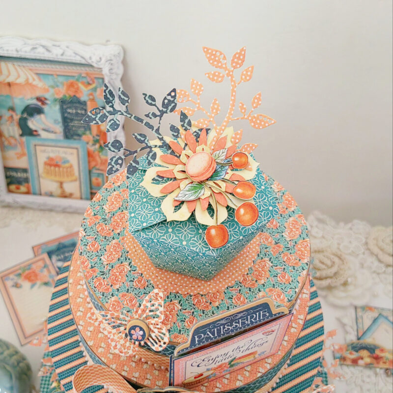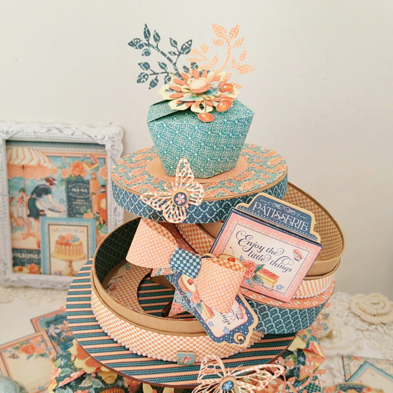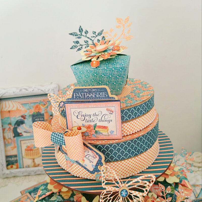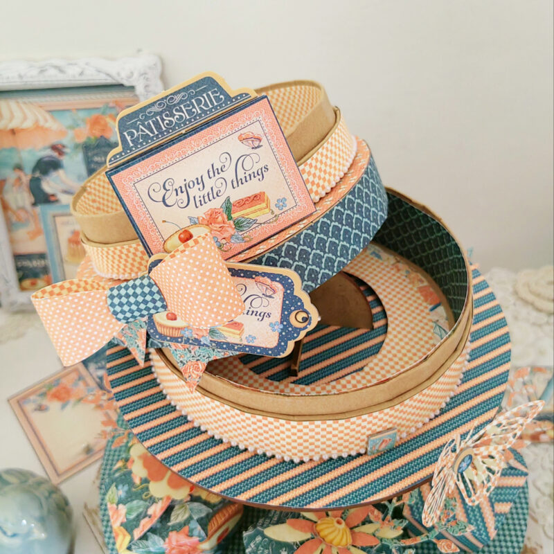 I used the cute Graphic 45 stacking circle box set for the ‘cake’ and added one cupcake box as the ‘topper’. I cut a piece out from the bottom of the large circle box, thus making sure it will fit on the top tier of the cupcake stand. I decorated these boxes with the pattern papers from the collection.