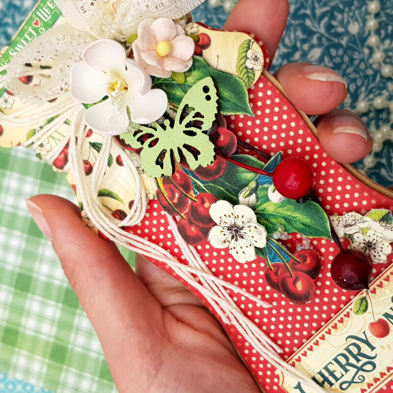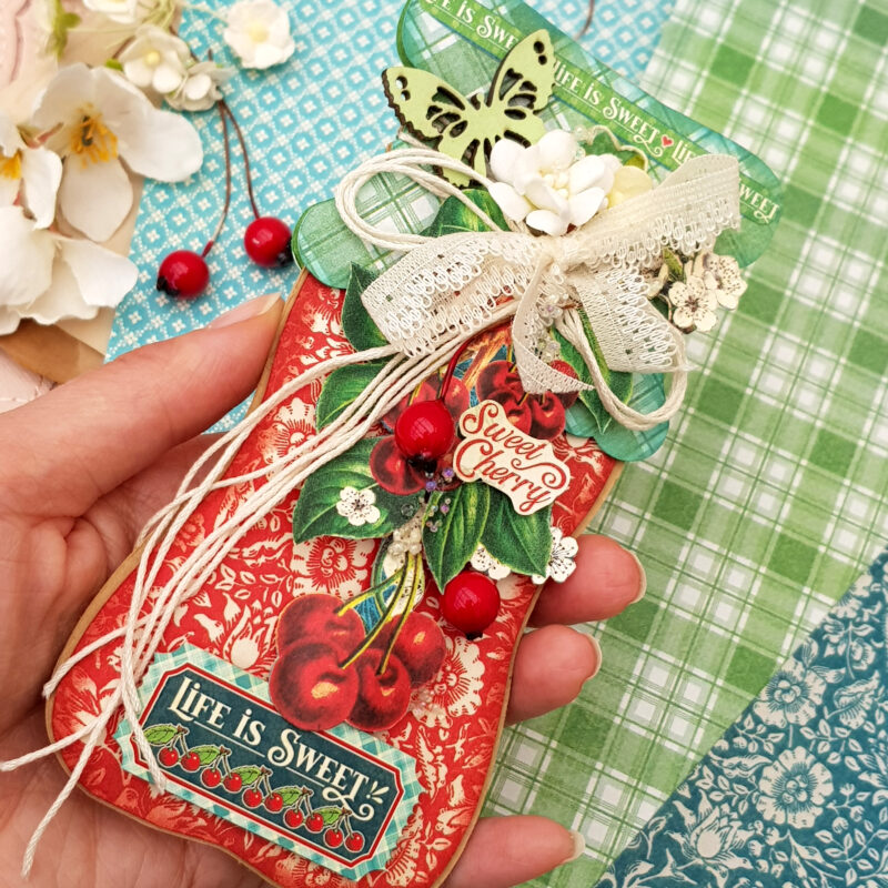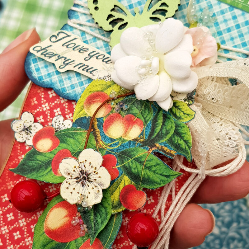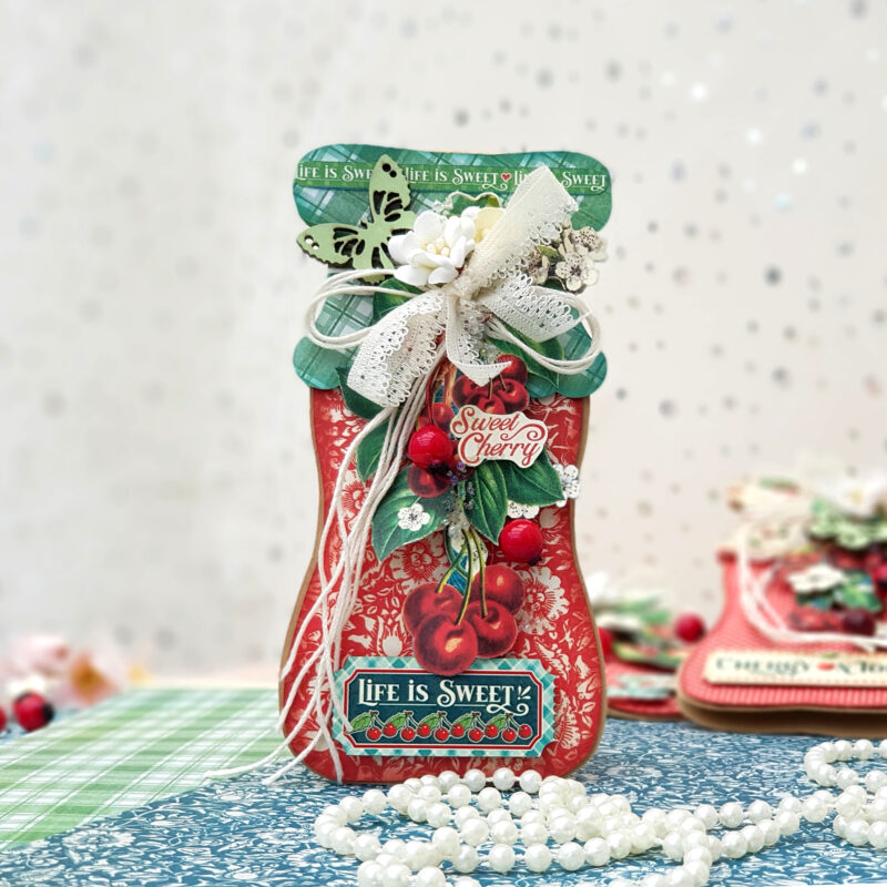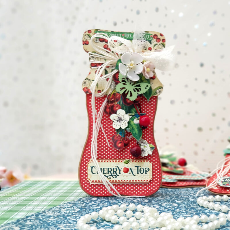 Today I present to you greeting cards in an unusual form – cherry jam jars. The beautiful and delicious collection called Life’s a Bowl of Cherries has served as inspiration for me. I created the jam jar as a base myself, and only half of it is needed. It’s very easy to flip the half to the side and join it to create a jar. Flipping it upwards again creates a base for the greeting card.