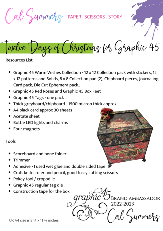 We have found the PERFECT holiday project, a Christmas Box filled with Folios! The Twelve Days of Christmas – Little Folios and DIY Box have been created for us by the fabulous, Cal Summers. You are going to love her video tutorial, as it guides you through technique after technique, teaching us how to create 12 mini folios AND this brilliant light-up box. This project features our Warm Wishes paper collection but could be done up with any of our collections to match any room or theme.