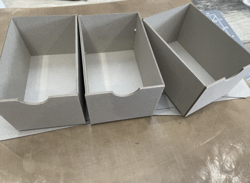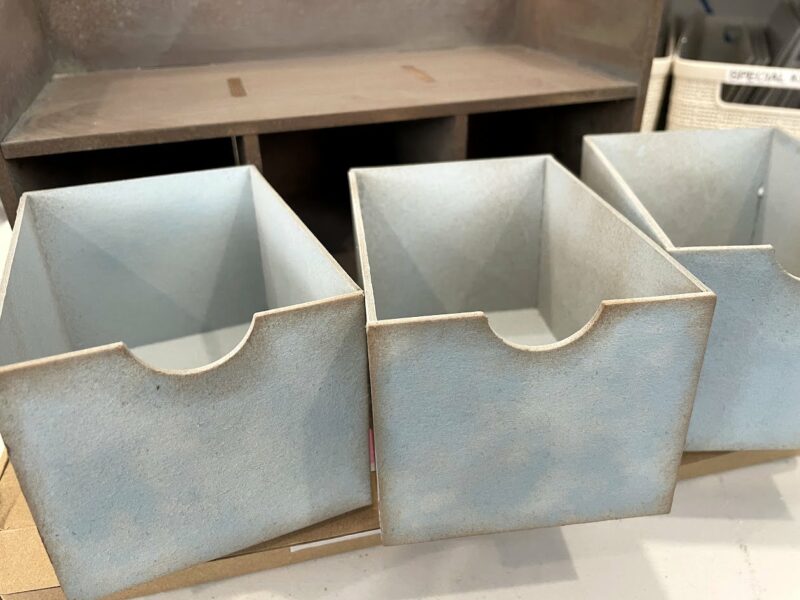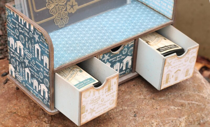 It is a very strong and sturdy base with MDF top and sides. What I really love about this project, it had layering panels cut ⅛” shorter on all sides so you could very easily trace it out onto paper, fussy cut out and adhere it to the base, it was really that easy. This is what it looked like prior to any color. While I was waiting for the base to dry, I assembled the drawers. These came about rather quickly, so I left the adhesive dry.