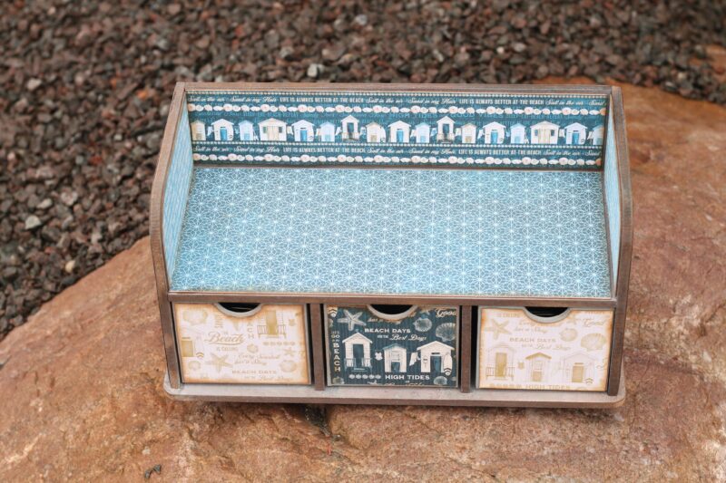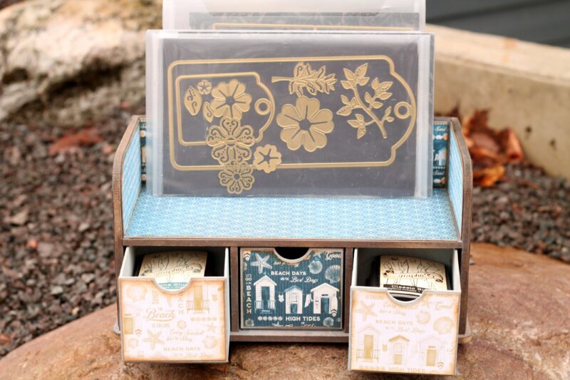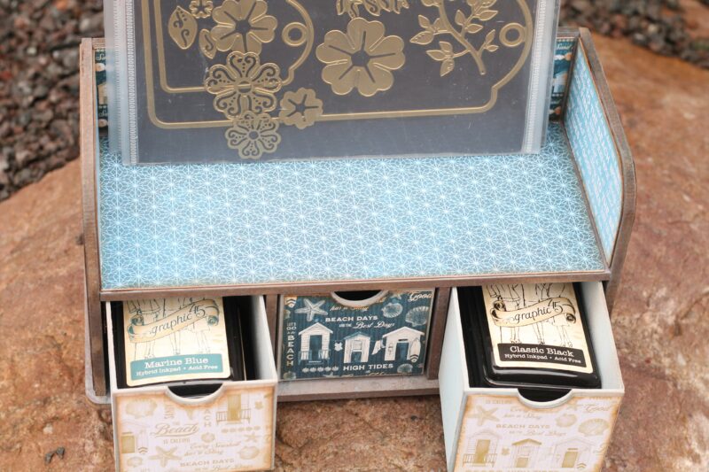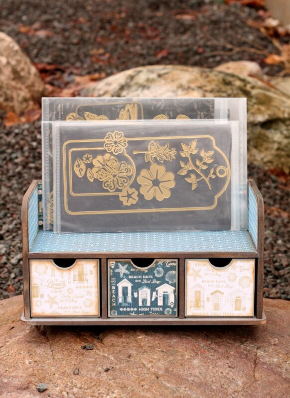 Welcome back to the Graphic 45 blog, your ultimate source for creative inspiration and crafting adventures. Today, we have a special treat for you as Karan Gerber showcases her latest project featuring the stunning The Beach is Calling paper collection. Karan has designed a beautiful and functional desktop organizer that perfectly combines style and practicality. Whether you’re looking to tidy up your crafting space or just eager to try something new, this storage solution is sure to spark your imagination and get those creative juices flowing.