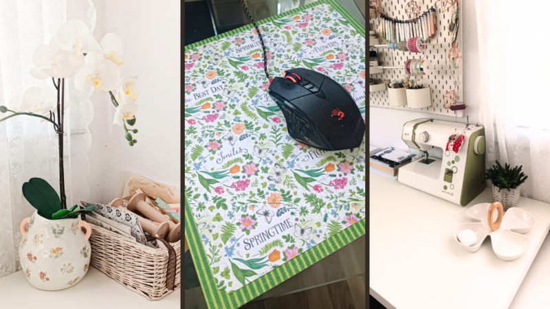 Teresa’s custom mouse pad, made from Graphic 45 paper, adds a personal touch and inspiration to her desk setup.