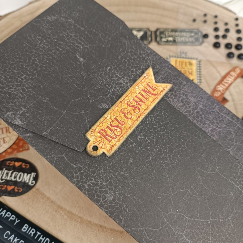 This is a masculine envelope and it’s really easy to make. I started with a pattern and solids paper from the collection, and i choose the solid in black. This solid part gives me the opportunity to create contrast and add more elements on top of my en without the fear of becoming