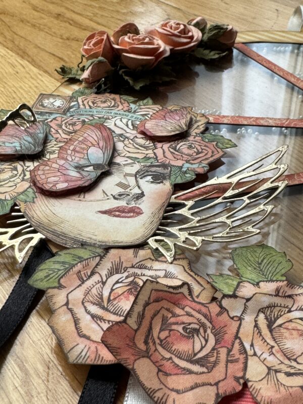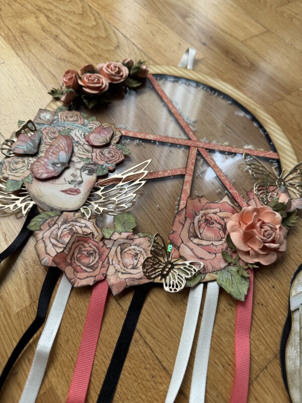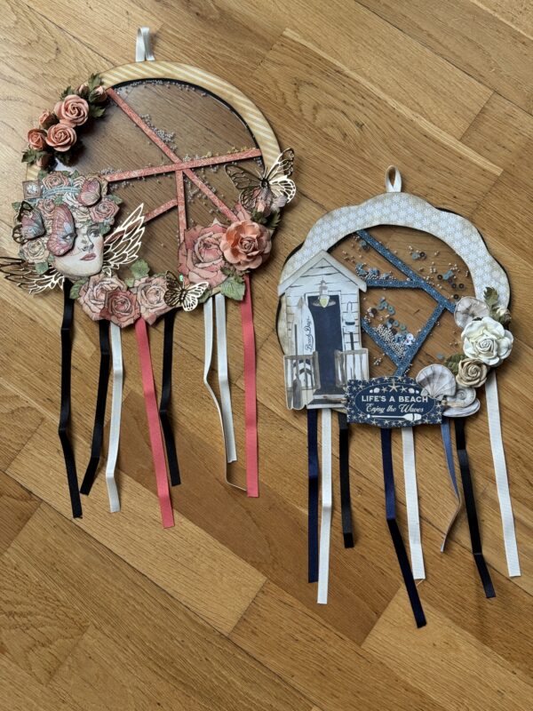 Today I want to show you a home decor piece. I love dream catchers and have been thinking about making one in paper for years. I made two, one in the lovely romantic paper collection and used flowers and butterflies and the second one is made in the newest paper The beach is calling.