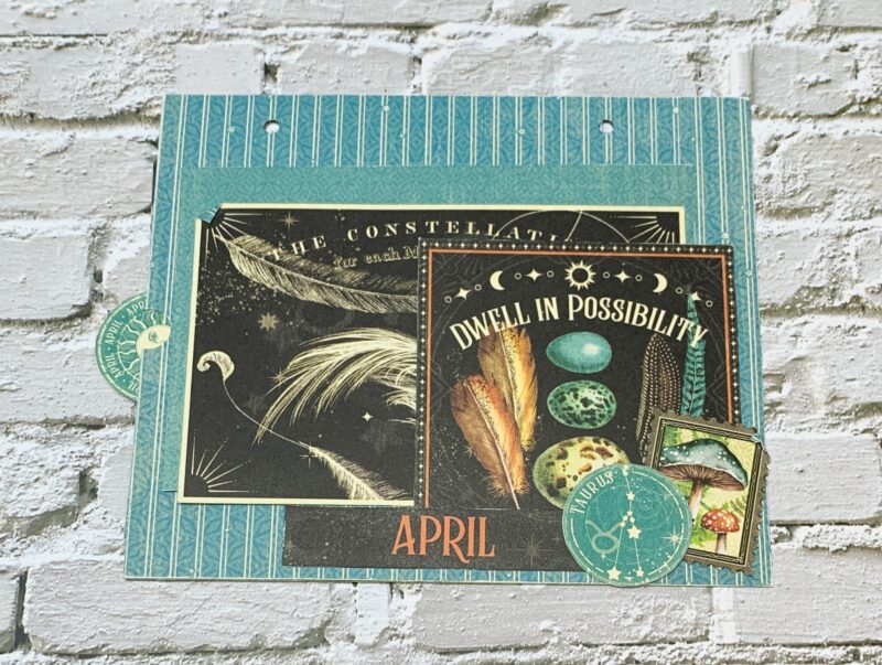 April Pocket Page Modification: From the second April page, I fussy cut the Taurus circle, stamp, feather image, large feather card and April title. I created a pocket out of the feather image and slid in the feather card and a 4”x6” blue patterns & solids paper. Around the pocket the taurus circle, stamp and April title were adhered.