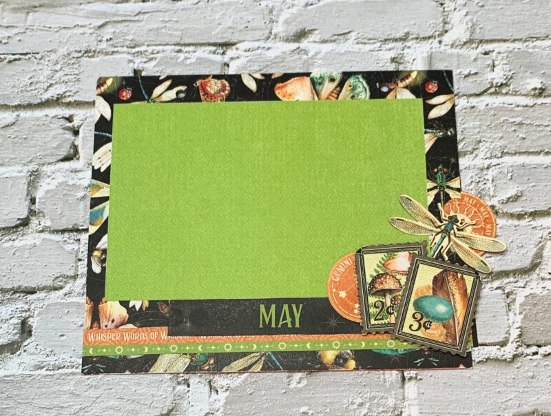 May Pocket Page Modification: From the second May page, I cut the stacked border to 7” and adhered ½” from the bottom of the pocket. From the second May page, I fussy cut the gemini circle, two stamps and May title. Cut a 4” x 6” green paper from the patterns & solids paper pack. Adhere the photo mat to the middle of the pocket. Around the photo mat, the dragonfly ephemera, two stamps, gemini circle and May title were adhered.