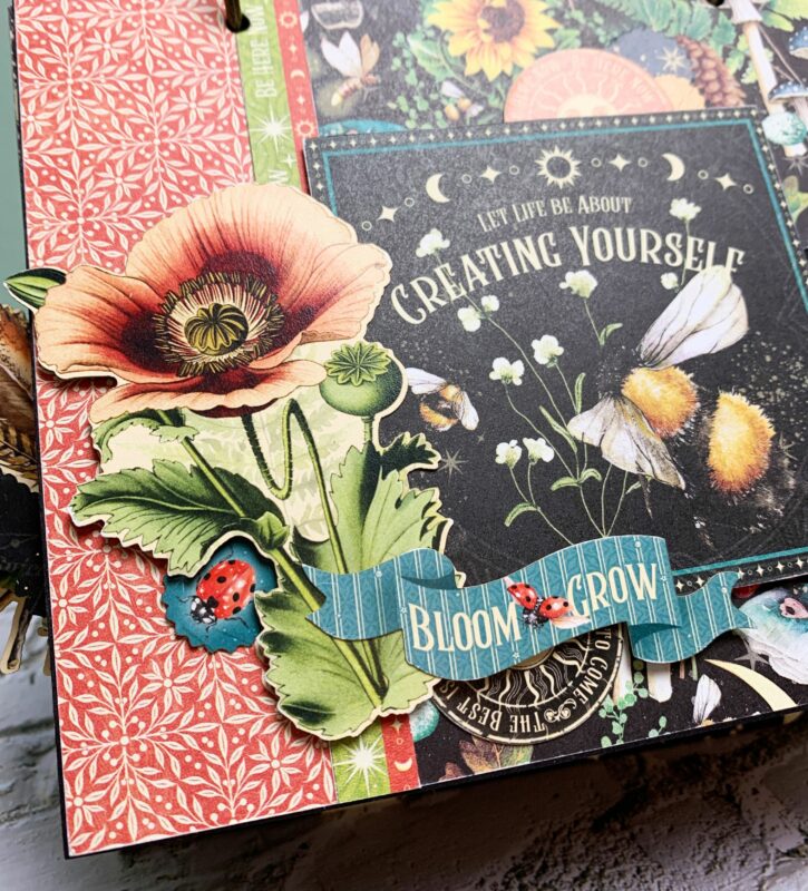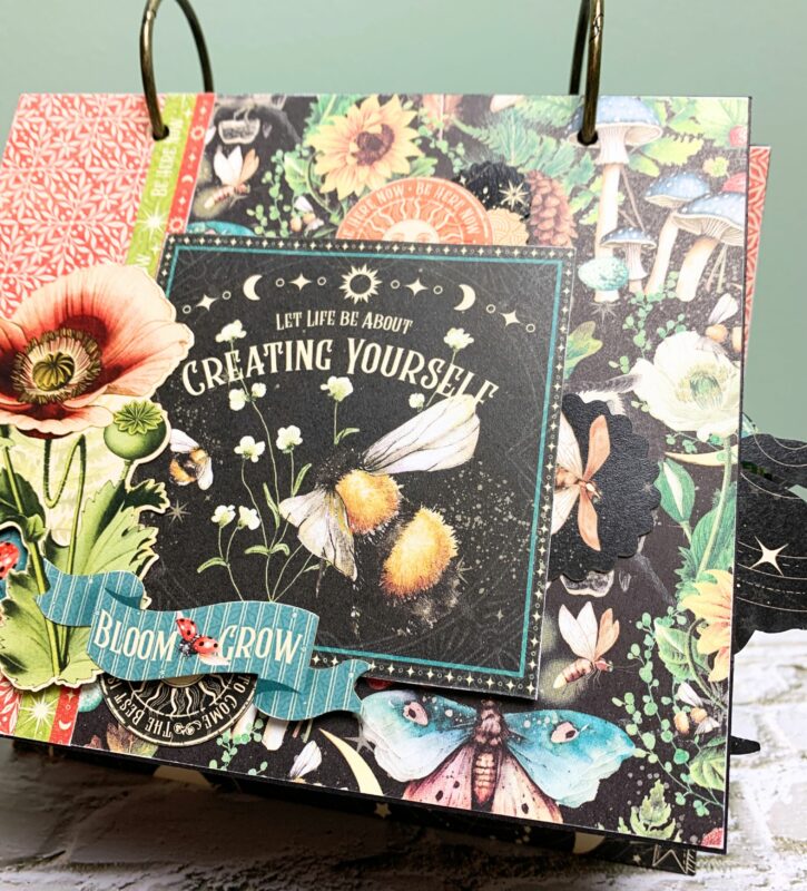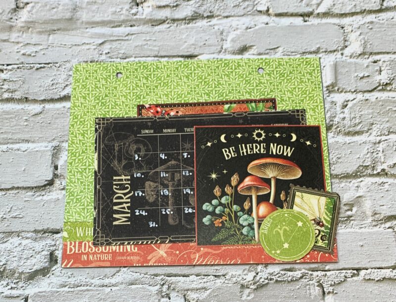 March Calendar Page Modification: I cut the backside of the March Paper to 5 ¼” x 7”. The red piece at the bottom of the page is 1” x 7”. Using a second March page, cut out the single border to 7” and adhere in between the two papers. Instead of using two stamps as a pocket, I used the mushroom image. The March calendar is adhered to a piece from the patterns & solids paper pack. I also added the ladybug quote to the top portion of the March calendar. I embellished the page using a stamp and aries circle. The calendar piece slides into the mushroom image.