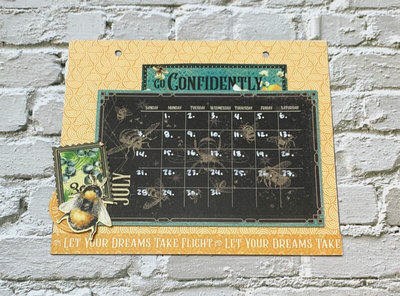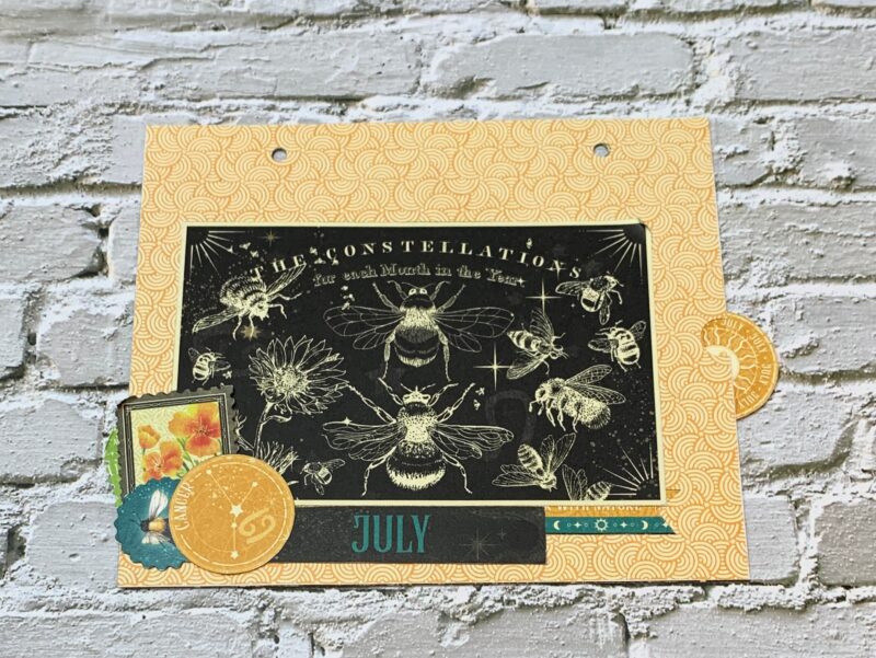 July Calendar Page Modification: I cut the backside of the June Paper to 6” x 7”. Using a second July page, cut out the single border to 7” and adhere at the bottom of the page. The July calendar is adhered to a piece from the patterns & solids paper pack. Adhere the Go Confidently piece to the top of the calendar. Embellish to the bottom left corner of the calendar using a stamp, Leo circle and the bee embellish out of the ephemera package.