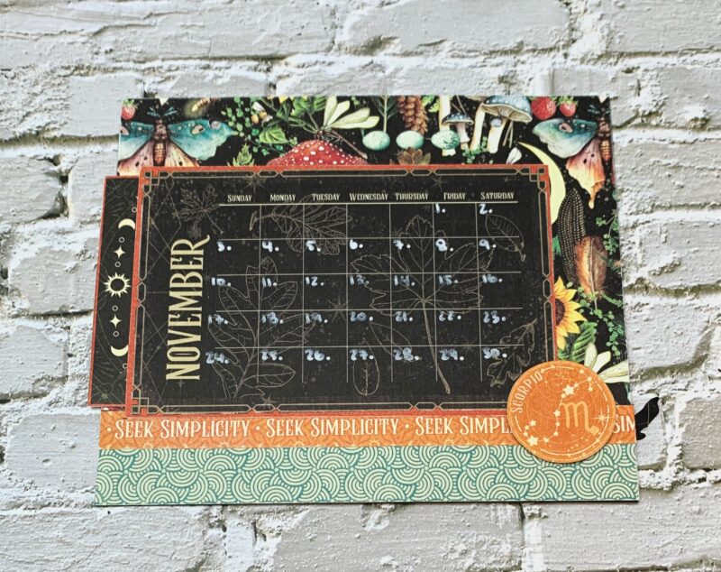 November Calendar Page Modification: I cut the backside of the November Paper to 5 ¼” x 7”. The blue piece at the bottom of the page is 1” x 7” from the patterns & solids paper pack. Using a second November page, cut out the single border to 7” and adhere in between the two papers. The November calendar is adhered to a piece from the patterns & solids paper pack and then adhered to the page at the top, right and bottom to create a pocket. I embellished the page using a scorpio circle from the second November page. The image piece slides into the pocket behind the calendar page.