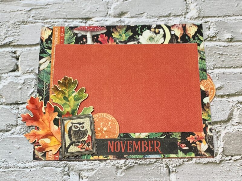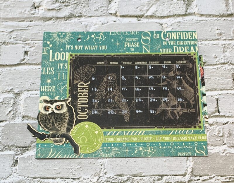 October Calendar Page Modification: I cut the backside of the October Paper to 6” x 7”. Using a second October page, cut out the stacked border to 7” and adhere ⅜” from the bottom of the page. The October calendar is adhered to a piece from the patterns & solids paper pack. Embellish the bottom left corner of the calendar using a Libra circle and the owl embellish out of the ephemera package.