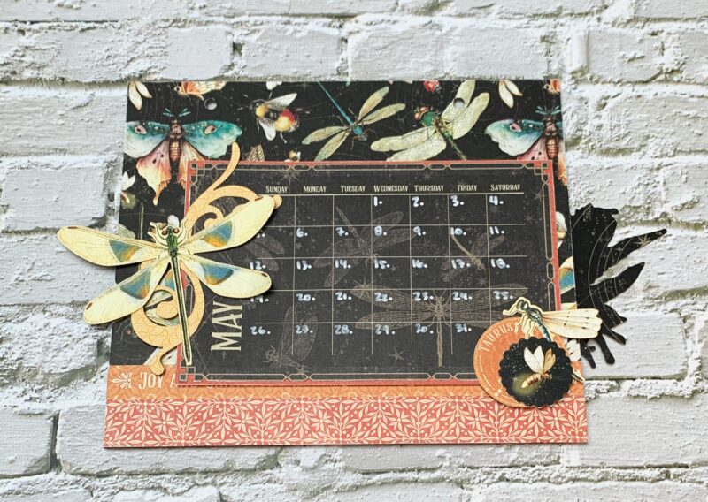 May Calendar Page Modification: I cut the backside of the May Paper to 5 ¼” x 7”. Cut a piece from the red patterned paper out of the patterns & solids that measures 1” x 7. Using a second May page, cut out the single border to 7” and adhere in between the two papers. The May calendar is adhered to a piece from the patterns & solids paper pack which I foam squared to the page. I embellished the page using a taurus circle as well as four ephemera pieces.