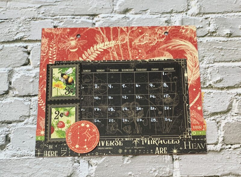 June Calendar Page Modification: I cut the backside of the June Paper to 5 ¼” x 7”. Cut a piece from the black patterned paper out of the patterns & solids that measures 1” x 7. Using a second June page, cut out the double border to 7” and adhere in between the two papers. The June calendar is adhered to a piece from the patterns & solids paper pack. I embellished the page using a gemini circle. Everything else stayed the same.