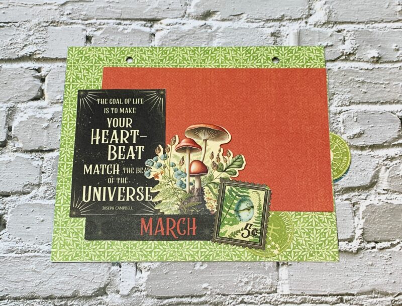 March Pocket Page Modification: From the second March page, I fussy cut the pisces circle, stamp, HeartBeat quote and March Title. I created a pocket out of the Heart Beat Quote and slid in a 4”x6” red pattern & solids paper. Around the pocket the pisces circle, stamp, January title and mushroom image from the ephemera pack were adhered.