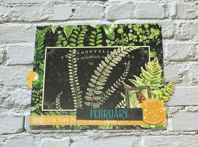 February Pocket Page Modification: From the second February page, I cut the single border to 7” and adhered ¼” from the bottom of the pocket. From the second February page, I fussy cut the pisces circle, stamp, February title and large fern card. The large fern card was foam squared to the middle of the page. Around the fern card, the fern ephemera, stamp, pisces circle and February title were adhered.