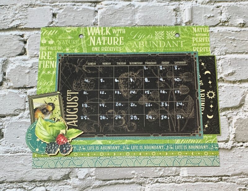 August Calendar Page Modification: I cut the backside of the August Paper to 5 ¼” x 7”. The blue piece at the bottom of the page is 1” x 7” from the patterns & solids paper pack. Using a second August page, cut out the stacked border and adhere in between the two pages. The August calendar is adhered to a piece from the patterns & solids paper pack and then adhere to the page at the top, right and bottom to create a pocket. I embellished the page using a stamp, Leo circle and Image piece from the second August page. The image piece slides into the pocket behind the calendar page. Also the blackberry image is out of the Life is Abundant Ephemera Assortment.
