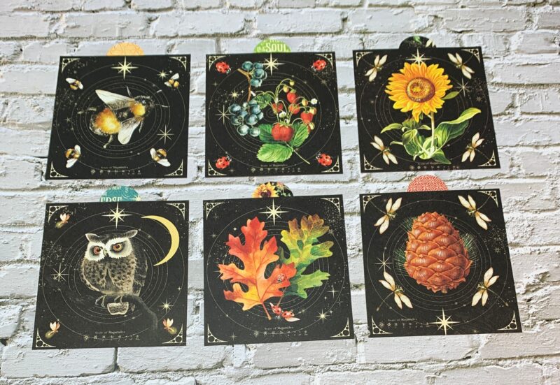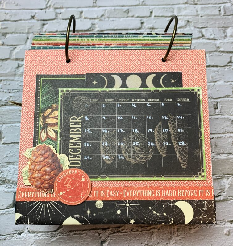 December Calendar Page Modification: I cut the backside of the December Paper to 5 ¼” x 7”. The black piece at the bottom of the page is 1” x 7” from the patterns & solids paper pack. Using a second December page, cut out the single border to 7” and adhere in between the two papers. The December calendar is adhered to a piece from the patterns & solids paper pack. I embellished the page using the pinecone image, capricorn circle and moon images from the second December page. The pinecone image in the bottom left corner of the calendar is from the ephemera package.