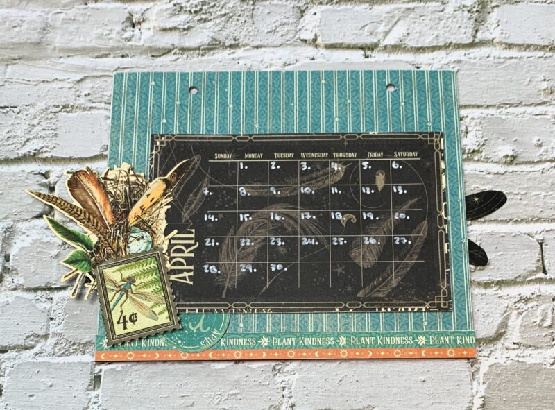 April Calendar Page Modification: I cut the backside of the April Paper to 6” x 7”. Using a second April page, cut out the double border to 7” and adhere at the bottom of the page. The April calendar is adhered to a piece from the patterns & solids paper pack which I foam squared to the page. I embellished the page using a stamp as well as the feather ephemera piece.
