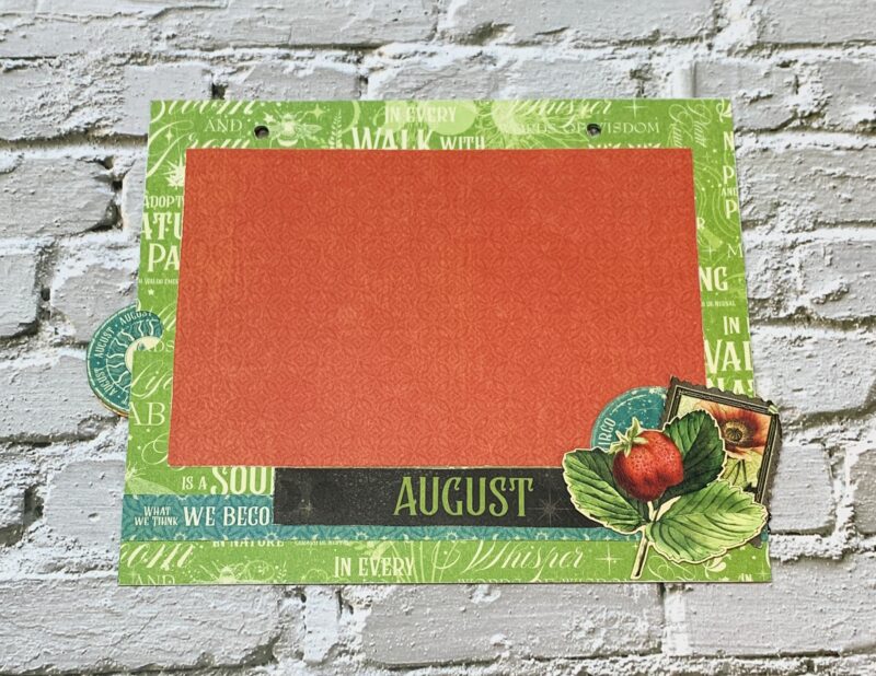 August Pocket Page Modification: From the second August page, I cut the single border to 7” and adhered ½” from the bottom of the pocket. From the second August page, I fussy cut the virgo circle, stamp and August title. Cut a 4” x 6” red paper from the patterns & solids paper pack. Adhere the photo mat to the middle of the pocket. Around the photo mat, the stamp, virgo circle, May title and strawberry ephemera were adhered.