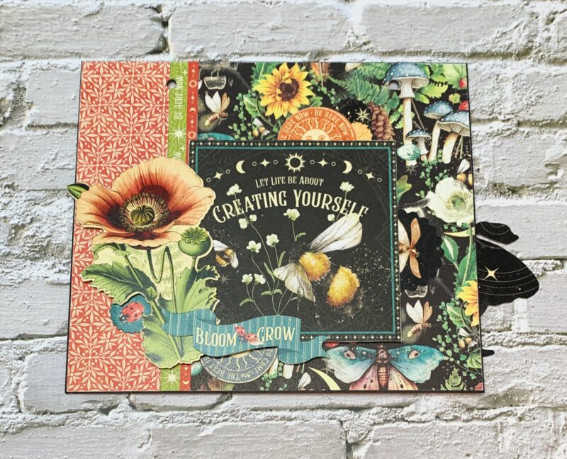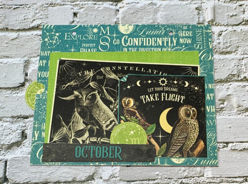 October Pocket Page Modification: From the second October page, I fussy cut the Scorpio circle, owl image, large owl card and October title. I created a pocket out of the owl image and slid in the owls card and a 4”x6” green patterns & solids paper. Around the pocket the scorpio circle, and October title were adhered.