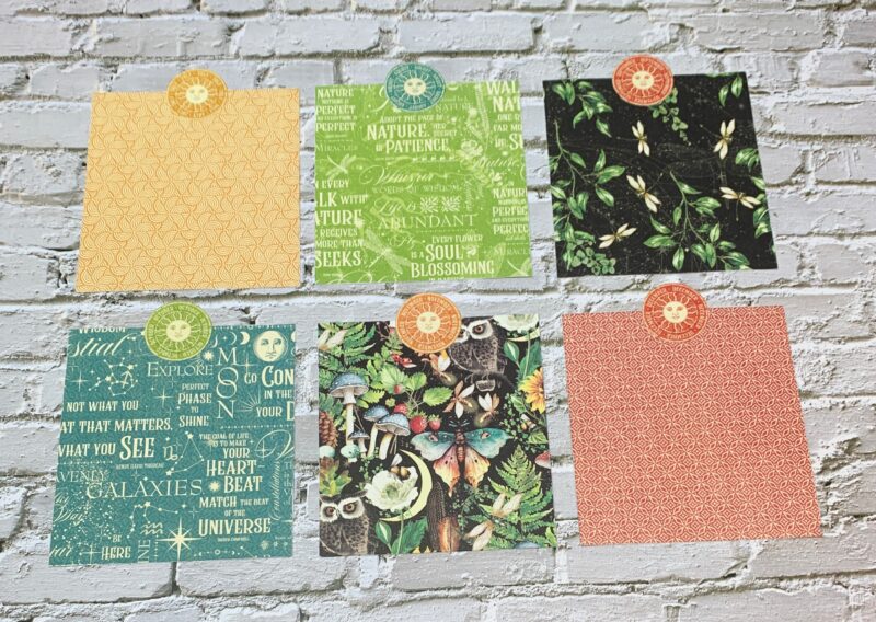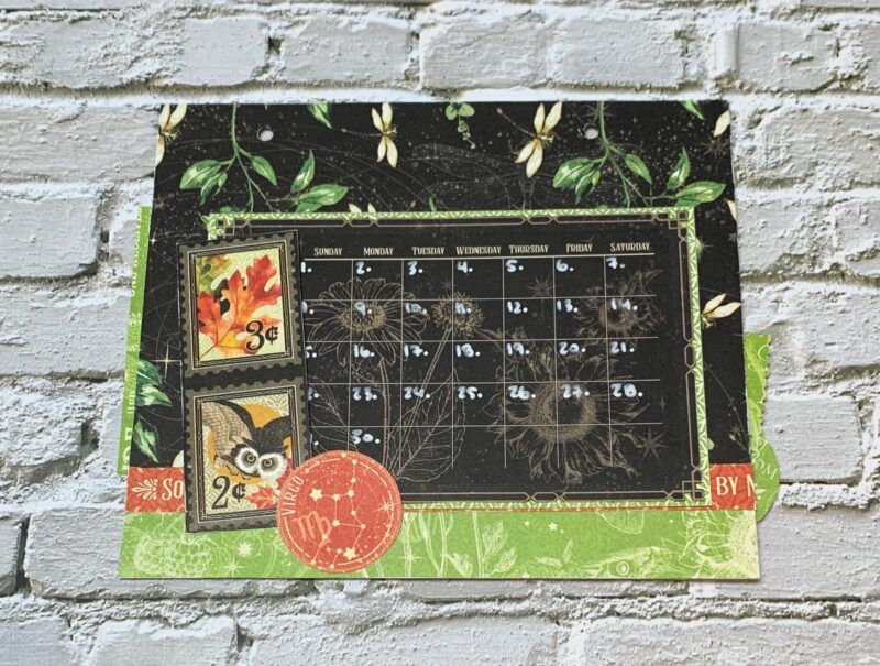 September Calendar Page Modification: I cut the backside of the September Paper to 5 ¼” x 7”. Cut a piece from the green patterned paper out of the patterns & solids that measures 1” x 7. Using a second September page, cut out the single border to 7” and adhere in between the two papers. The September calendar is adhered to a piece from the patterns & solids paper pack. I embellished the page using a virgo circle. Everything else stayed the same.