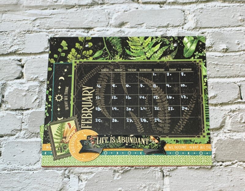 February Calendar Page Modification: I cut the backside of the February Paper to 5 ¼” x 7”. The green piece at the bottom of the page is ¾” x 7”. Using a second February page, cut out the stacked border to 7” and adhere in between the two pages. The February calendar is adhered to a piece from the patterns & solids paper pack and then adhered to the page at the top, right and bottom to create a pocket. I embellished the page using a stamp, aquarius circle and Image piece from the second February page. The image piece slides into the pocket behind the calendar page. Also the Life is Abundant Banner out of the Life is Abundant Ephemera Assortment.
