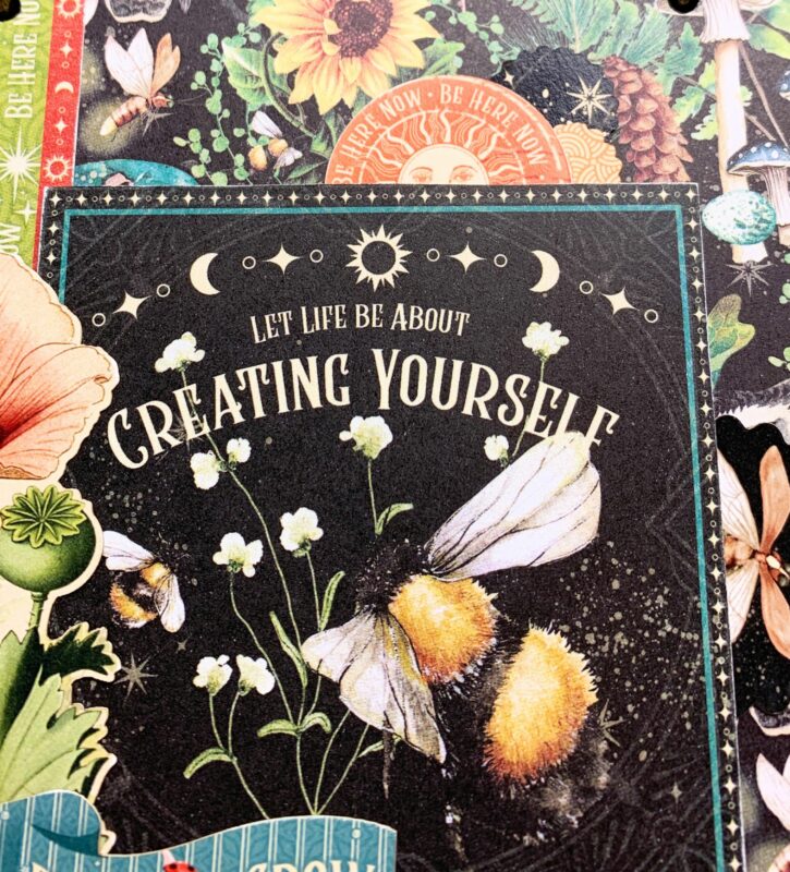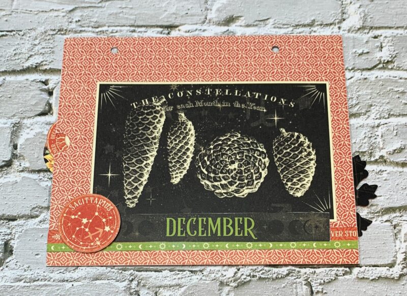 December Pocket Page Modification: From the second December page, I cut the double border to 7” and adhere it ½” from the bottom of the pocket. From the second December page, I fussy cut the sagittarius circle, December title and large pinecone card. The large pinecone card was adhered to the middle of the page. Around the pinecone card, the sagittarius circle and December title were adhered.