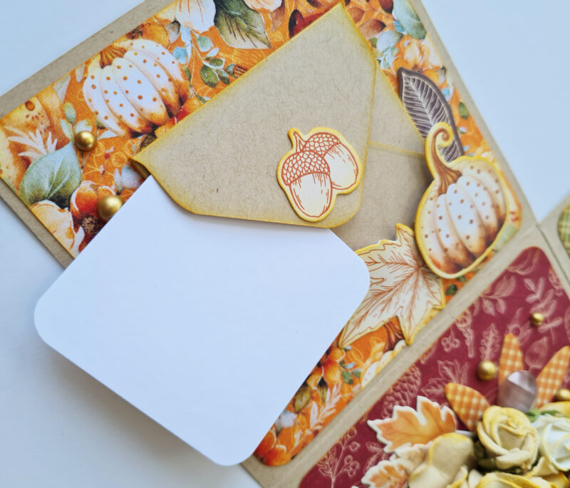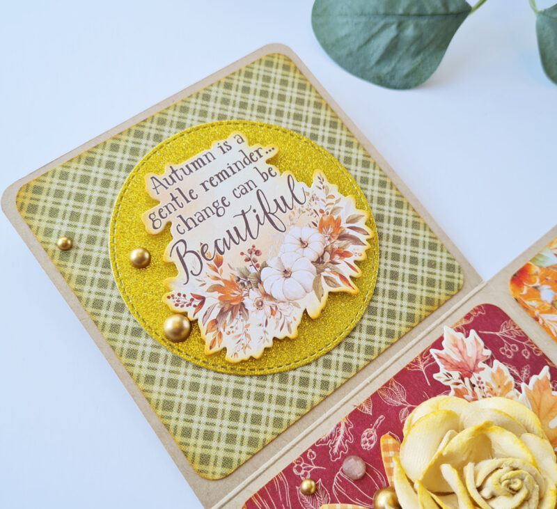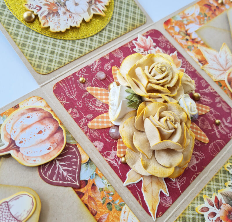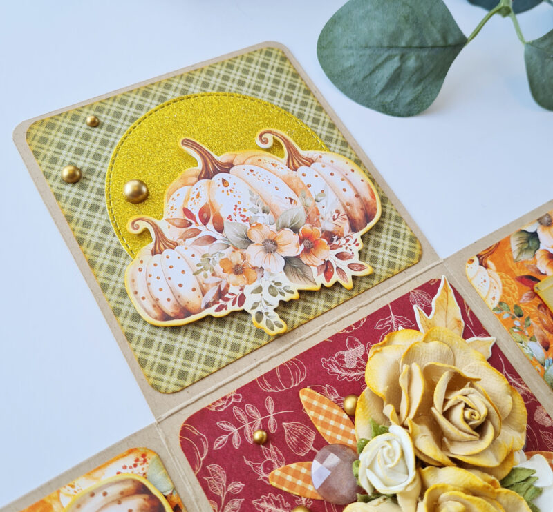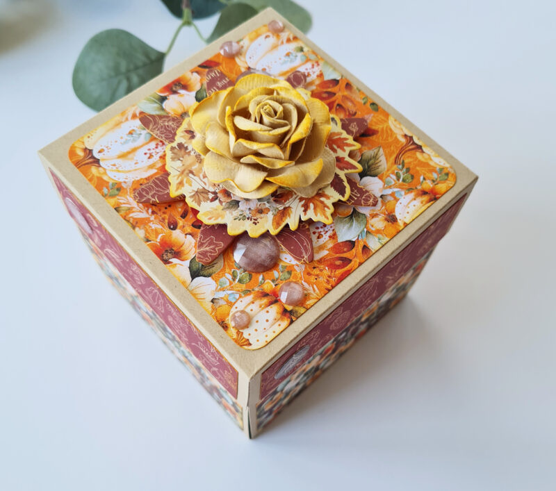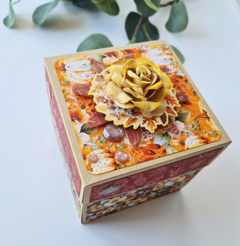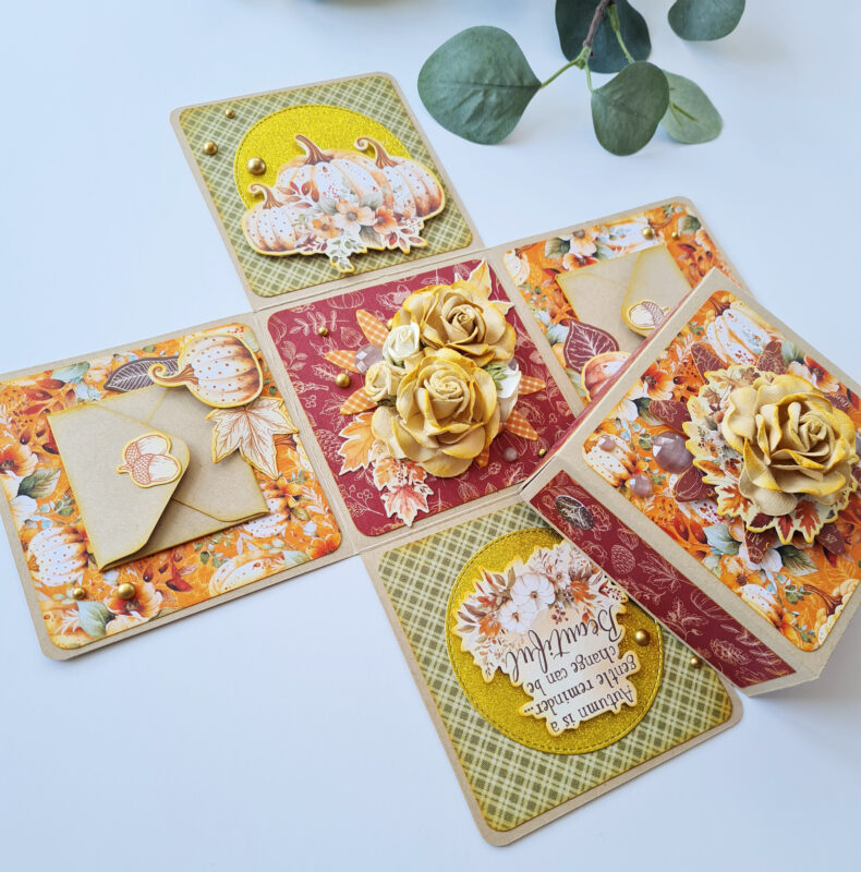 The Autumn Greetings collection instantly captivated me with its vibrant colours and enchanting images. This inspiration led me to create one of my favourite projects: an exploding box or card.
