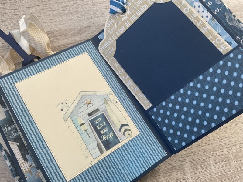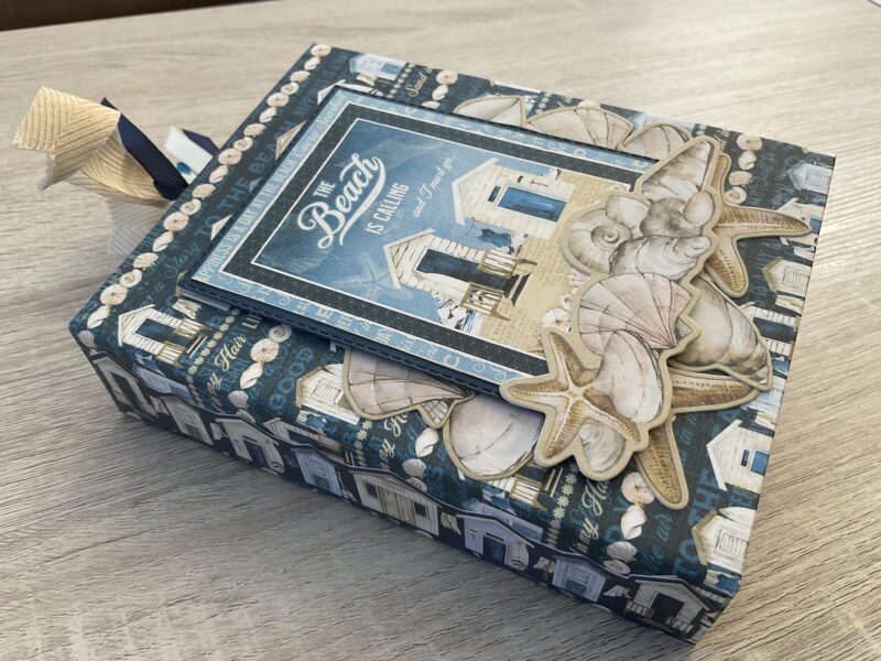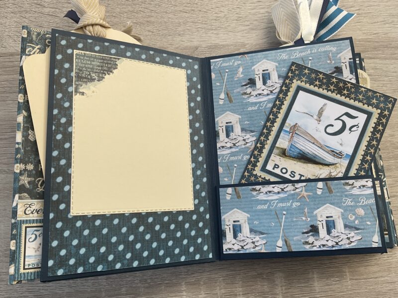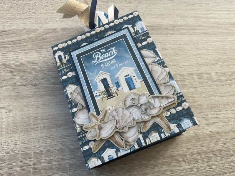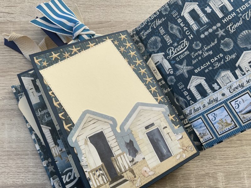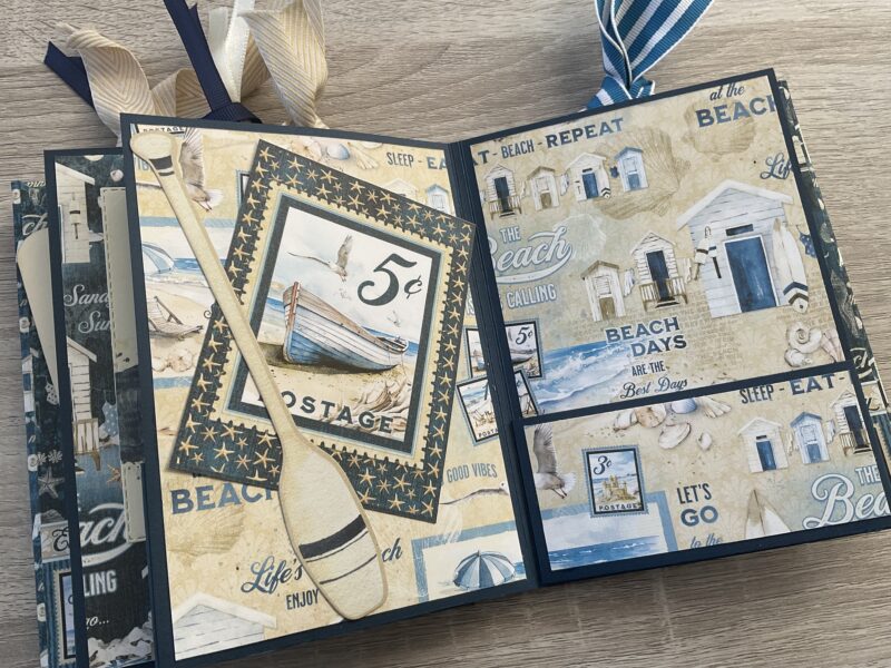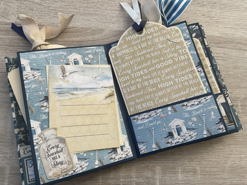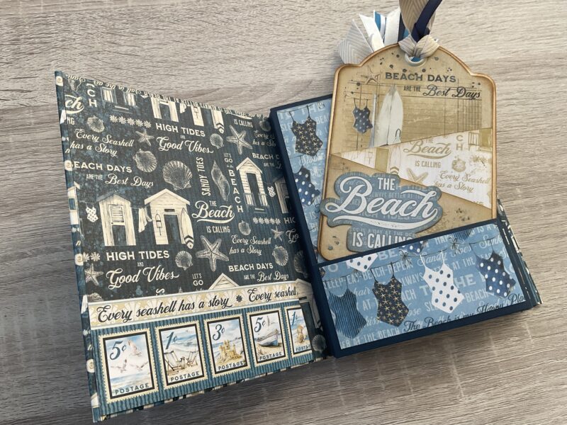 I am so pleased to be back for a second term with G45 and my ‘self-portrait’. This book is very me as I like to use my papers economically and play with dimensions to get the most out of each sheet. This book uses 6 sheets of 12×12 so you can get at least 3 from a regular pad. I also love the G45 tags so designed this book to hold them. I decorated mine with The Beach Is Calling papers and used some ephemera and rub ones to add some extra details.