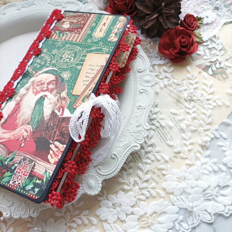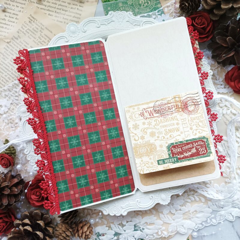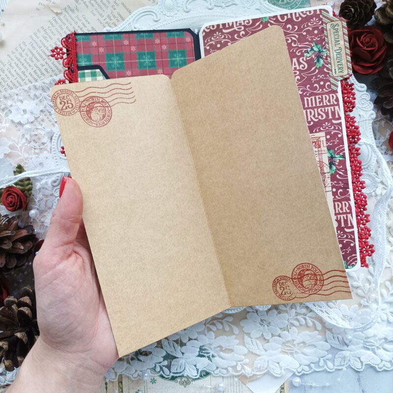 I laid out a space for myself on a black Travel Album with Notebook Set Black base. I prepared the sheets cut to the right size from a large block of “Letters to Santa” papers and rounded the corners of the sheets.