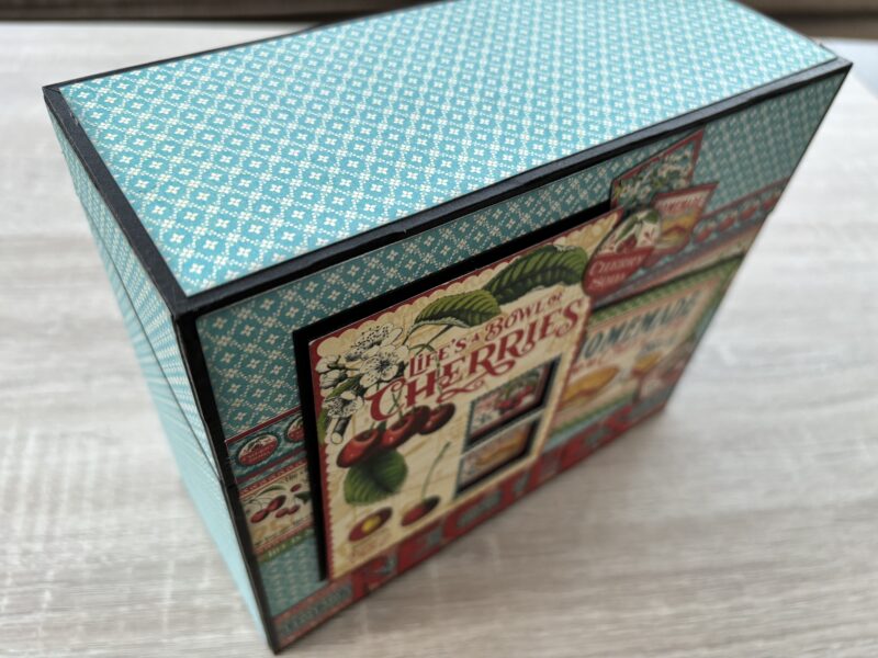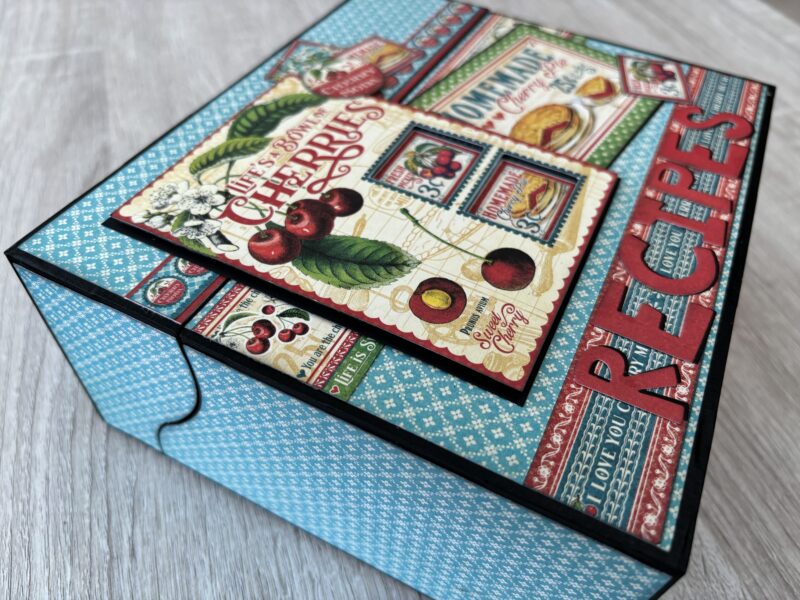 “Hello G45ers. It’s Paul here today with my effort for the monthly challenge #G45HomeDecor. I have decided to make a recipe box for the kitchen or dining room using Life’s a Bowl of Cherries. In the tutorial, I share my tips and tricks on how to add papers to sides that have odd shaped edges. I also show how tape can be used to construct a 3D item.” ~Paul