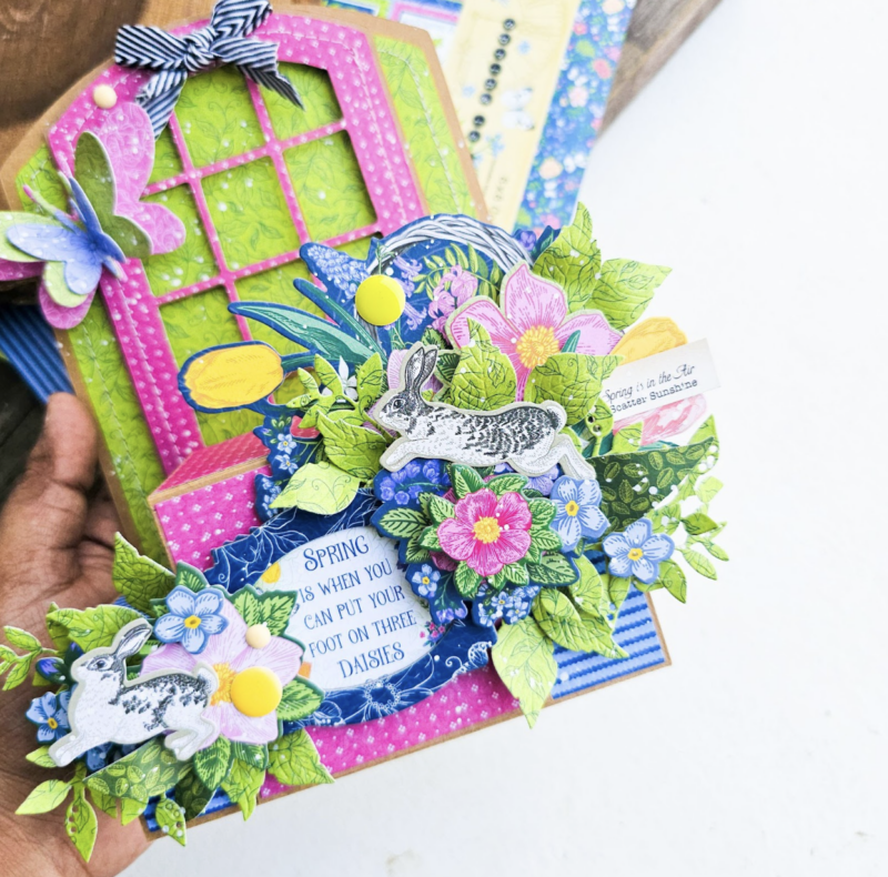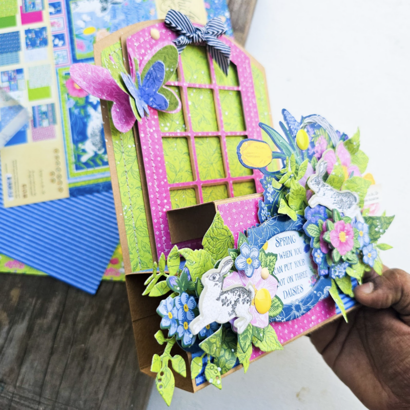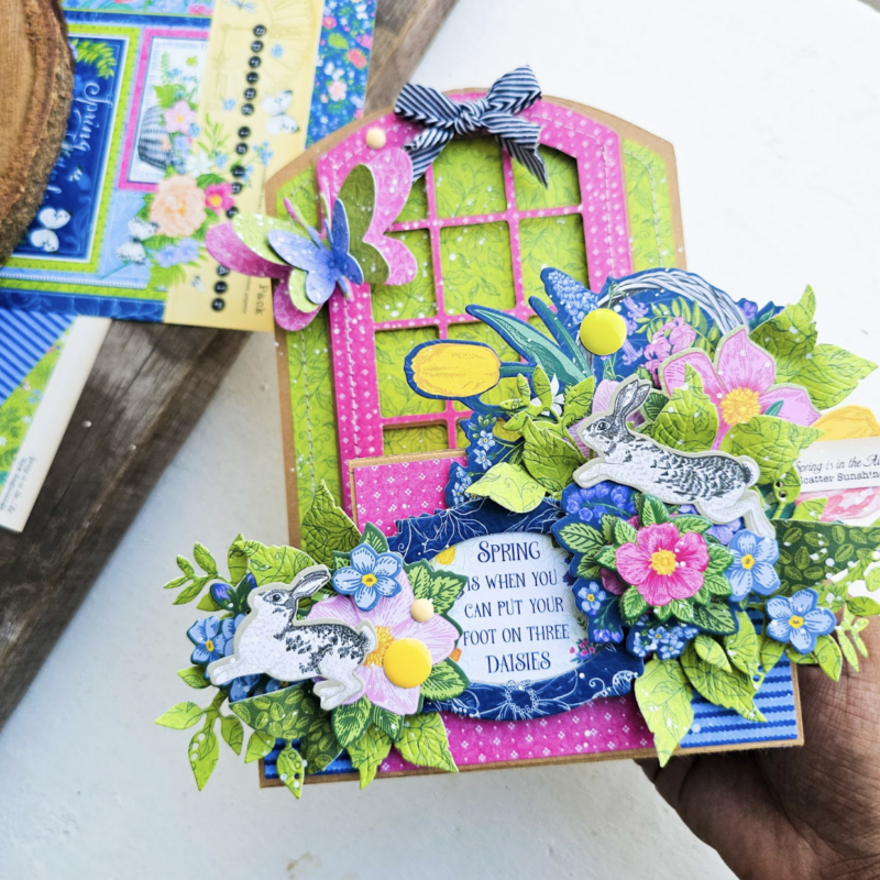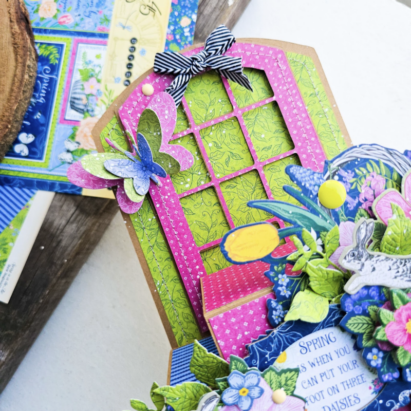 Today I’m making something that’s cute and full of spring goodness! It’s a desktop pop-up card using the beautiful Graphic 45 “Spring is in the Air” collection—because who doesn’t want a tiny window into spring sitting on their table?