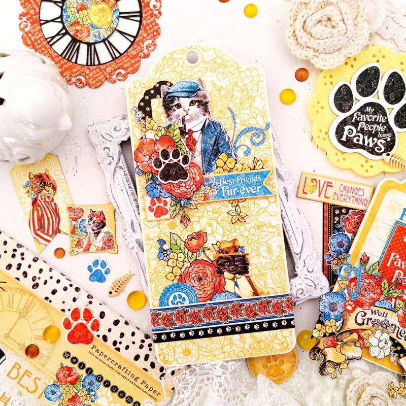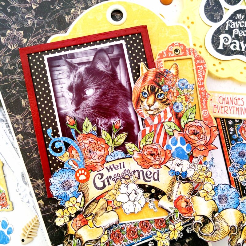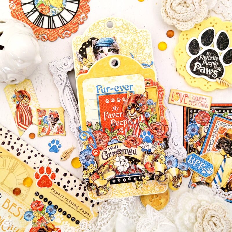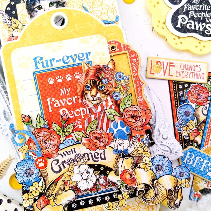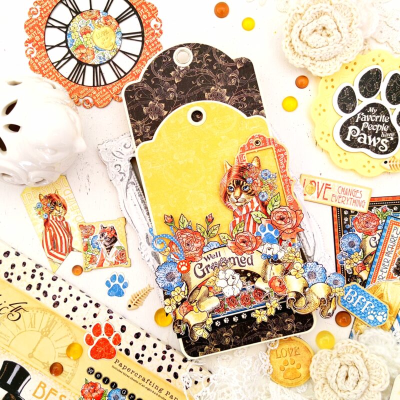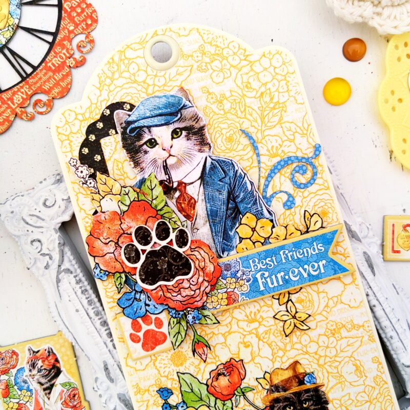 I created this set using two tags. The large tag has a strip at the bottom to be used as a pocket for the smaller tag. The fussy cut elements on this tag have been adhered in such a way to create more space, to add photos of your cute fur babies or journaling cards/ephemera.