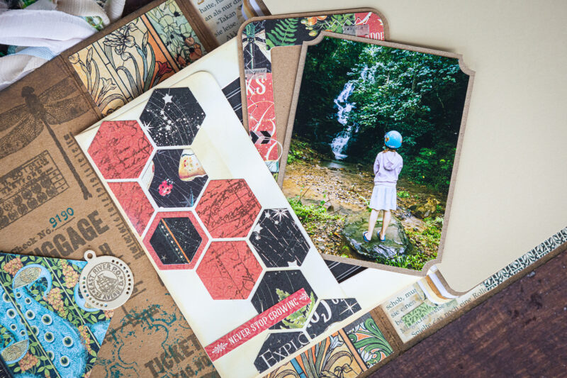 I’ve taken three envelopes from the A2 Cards 4 1/4″ x 5 1/2″ with Envelopes Ivory set and decorated them. For the first envelope, I used small square or rectangular paper scraps that I cut out into hexagons. Long scrapbook paper strips came in handy for the second envelope and I decorated the third envelope using paper leftovers of various shapes. Then I’ve added a photograph on each background.