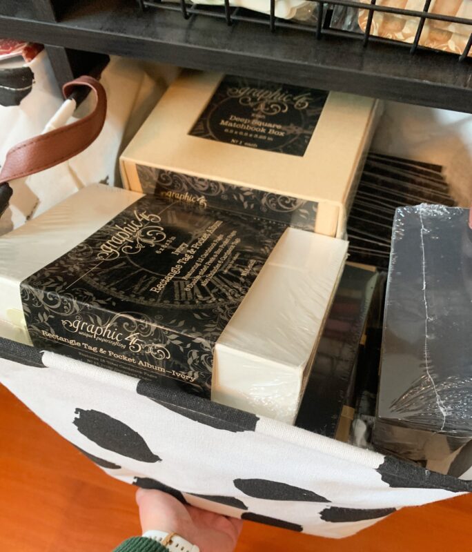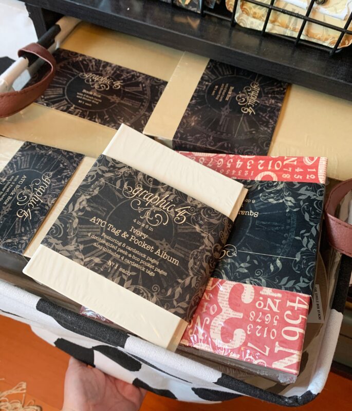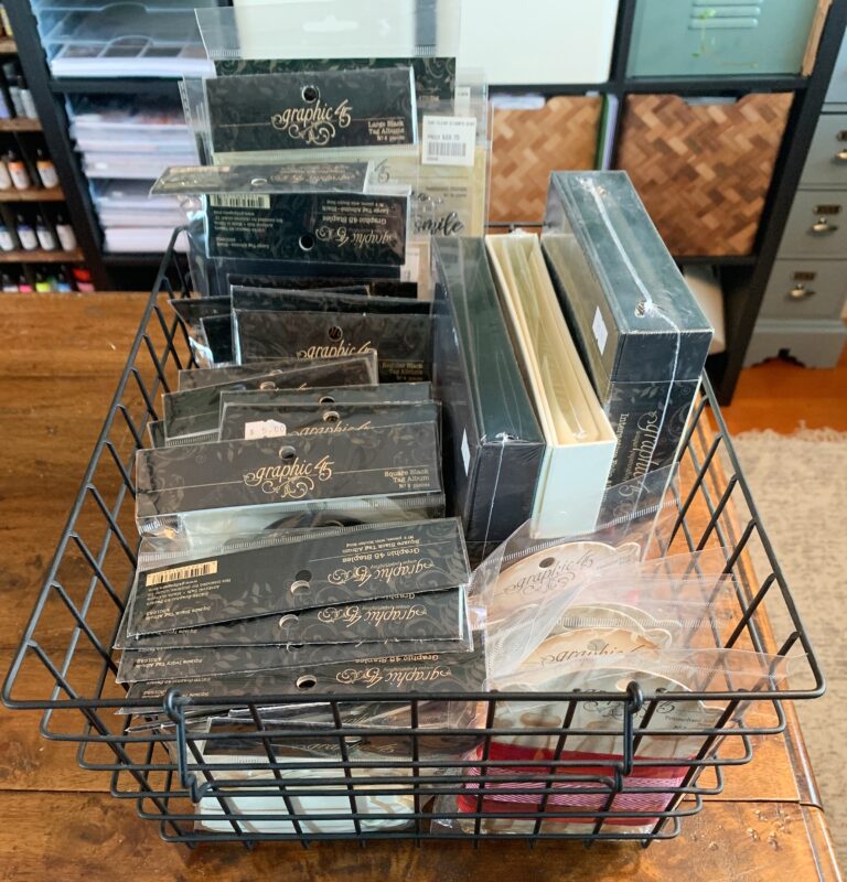 This basket holds the current Graphic 45 Albums, Ribbons, Tags, Stamps and Dies.Â