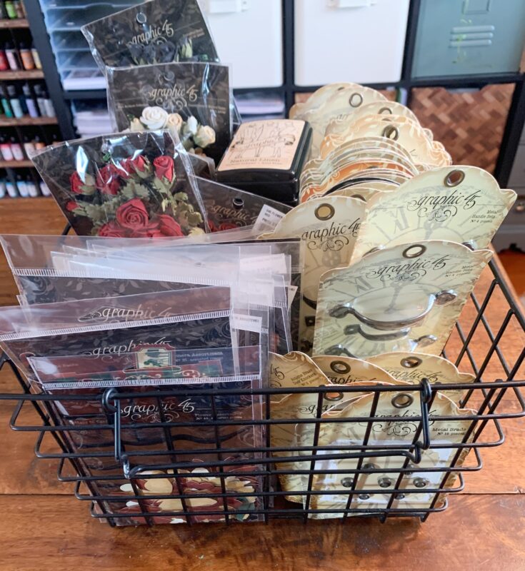 This basket holds the current Graphic 45 Ephemera, Flowers, Ink and Metal Staples.Â
