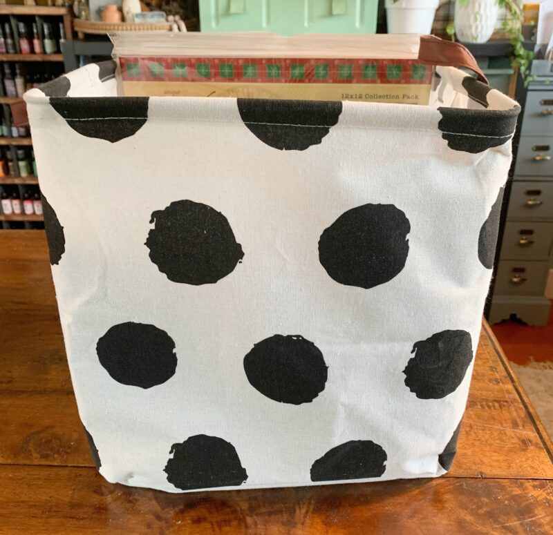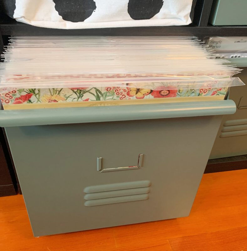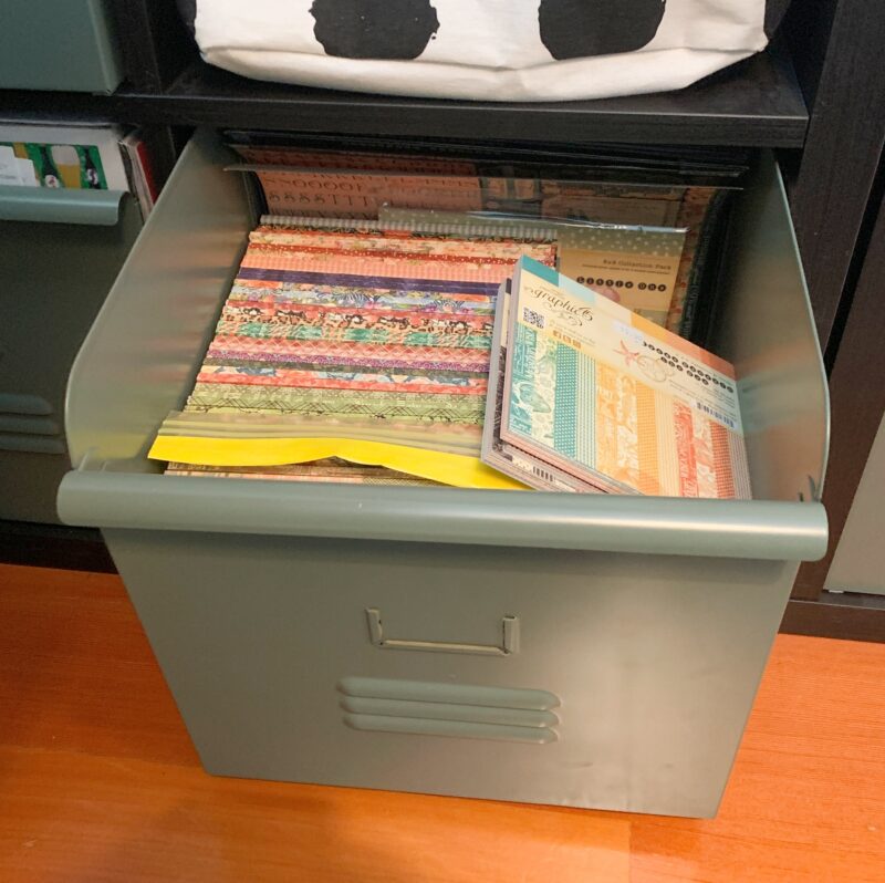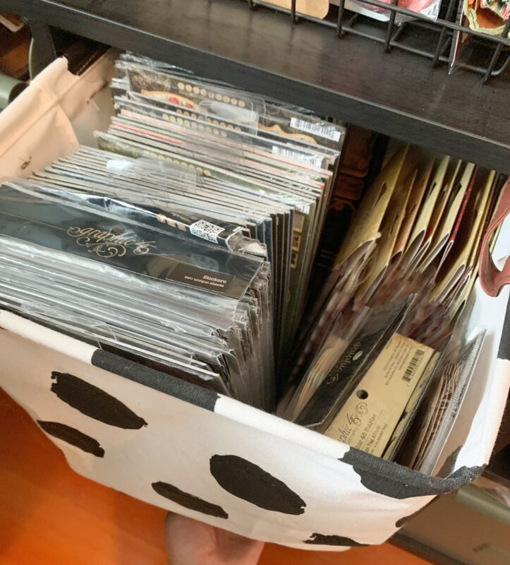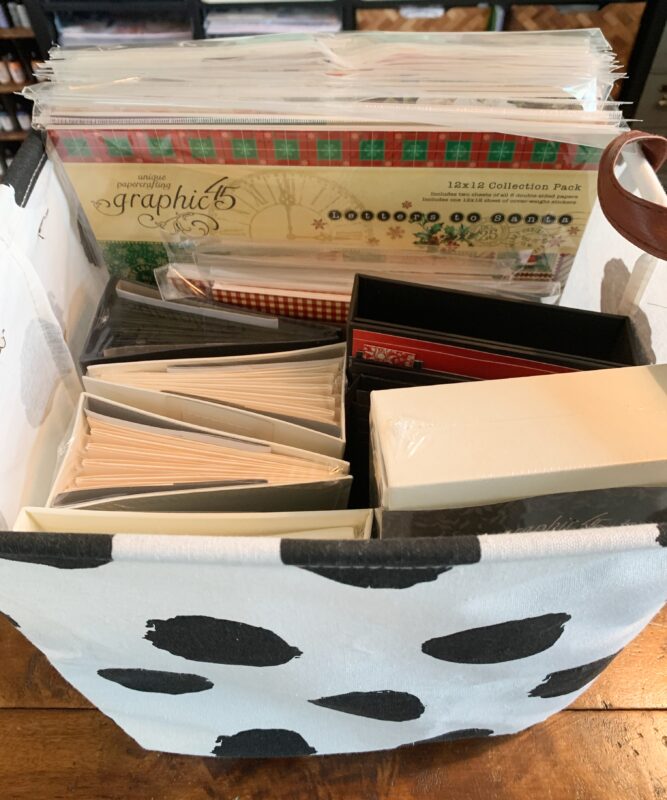 The current Graphic 45 paper collections and extra staples, stay in my dotted square basket.Â