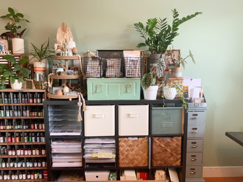 To the right of the mail sorting piece, is a single Ikea Kallax unit which holds my sewing machine and accessories as well as a variety of papercrafting supplies. I’ve also decorated the top of this unit with more plants, decor items and the green box holds completed projects. The unit to the right of the Kallax unit hold a variety of ephemera images.Â