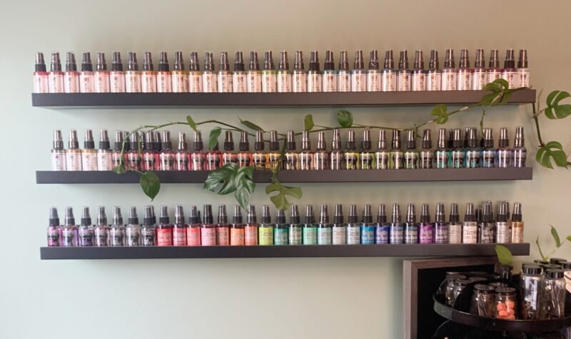 The last stop on my craft tour is the floating shelves that are to the left of my buffet that hold all of my sprays. Yes they are in colour family and create a beautiful rainbow.Â