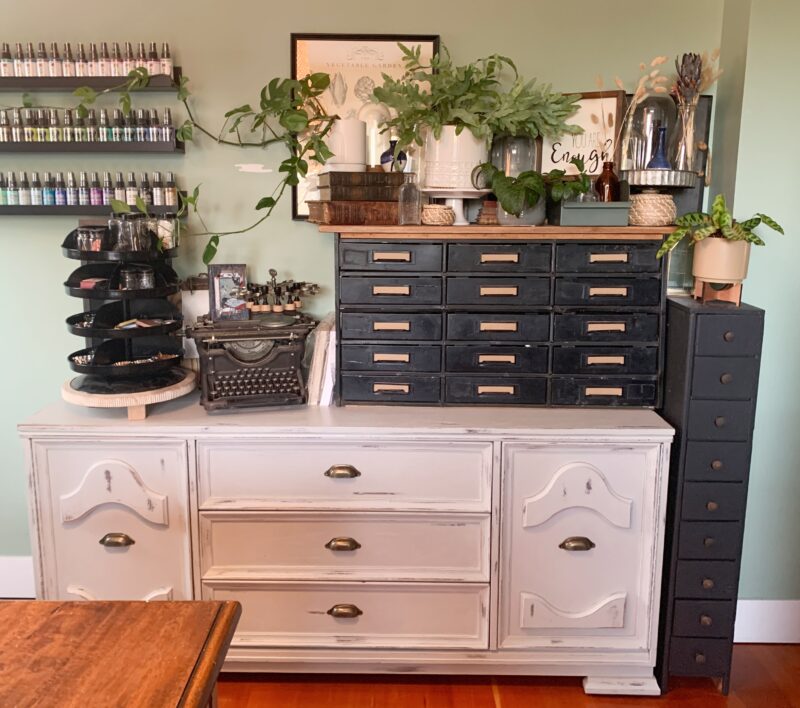 On the remaining wall, these are all furniture pieces that have been purchased from a variety of vintage stores. In the buffet piece, it holds a variety of props when taking photos as well as some more decor pieces. The piece to the right, the skinny one, holds paints and embossing powders. On top of the buffet, the black drawer unit holds all of my distress inks. On the remaining portion of the top of the buffet, holds embellishments, typewriter, and a variety of decor.Â