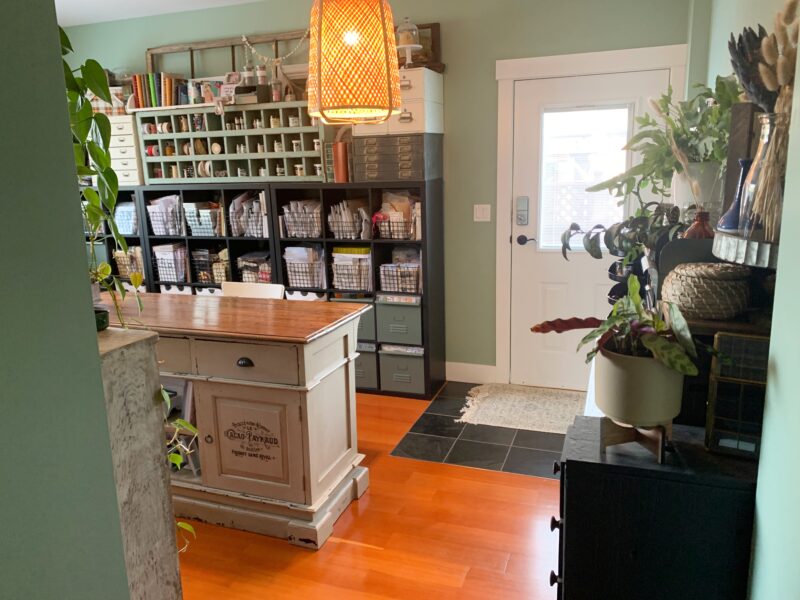 Behind my island, I have put two of the Ikea Kallax units together which provide a ton of storage for my craft supplies. There are a variety of bins and baskets. Above most of the furniture pieces have been curated from a variety of vintage stores and hold ribbon, pastes and flowers. As well they double as display for projects.Â